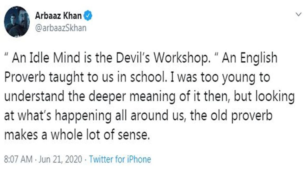 बॉलीवुड एक्टर सुशांत सिंह राजपूत (Sushant Singh Rajput) की मौत के बाद फिल्म इंडस्ट्री में नेपोटिज्म को लेकर बहस शुरू हुई। जिसमें बॉलीवुड एक्टर अरबाज खान और सलमान खान (Salman Khan) को सोशल मीडिया पर जमकर ट्रोल किया जा रहा था। उनपर भाई-भतीजावाद को बढ़ावा देने का आरोप लग रहे हैं। कोर्ट केस करने से पहले अरबाज इन ट्रोलर्स को सोशल मीडिया पर भी जवाब दे चुके थे। उन्होंने ट्रोल करने वालों के लिए 'खाली दिमाग, शैतान का घर' कहावत के जरिए निशाना साधा था।