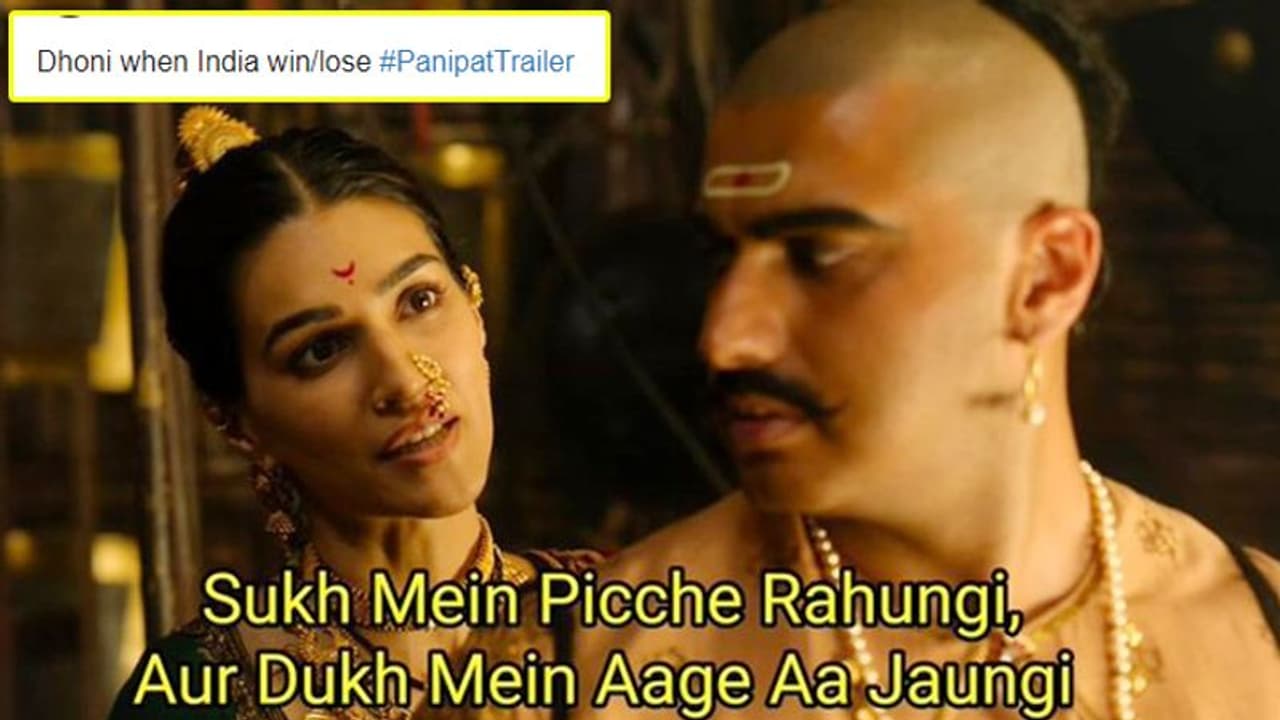 दरअसल, सोशल मीडिया यूजर्स अर्जुन कपूर और कृति सेनन के उस सीन को लेकर कमेंट्स कर रहे हैं जब ट्रेलर में अर्जुन यूद्ध लड़ने जाते हैं। तब कृति उनसे कहती हैं, 'सुख में पीछे रहूंगी और दुख में आगे आ जाऊंगी।' इस पर लोग मीम्स बना रहे हैं। एक यूजर ने इस सीन को शेयर करते हुए लिखा, 'धोनी ऐसा ही कहते हैं जब इंडिया जीतती और हारती है।' दूसरे ने लिखा, 'मिडिल क्लास के लोगों के साथ ईएमआई इंस्टॉलमेंट के समय ऐसा होता है।' वहीं, एक ने तो इस सीन को दिल्ली की धूंध से जोड़ दिया। ऐसे ही ट्विटर पर तमाम तरह से यूजर्स मीम्स बनाकर कमेंट्स कर रहे हैं।