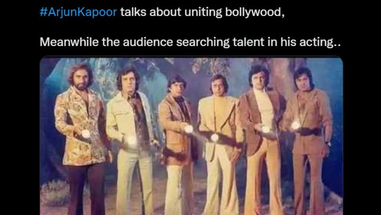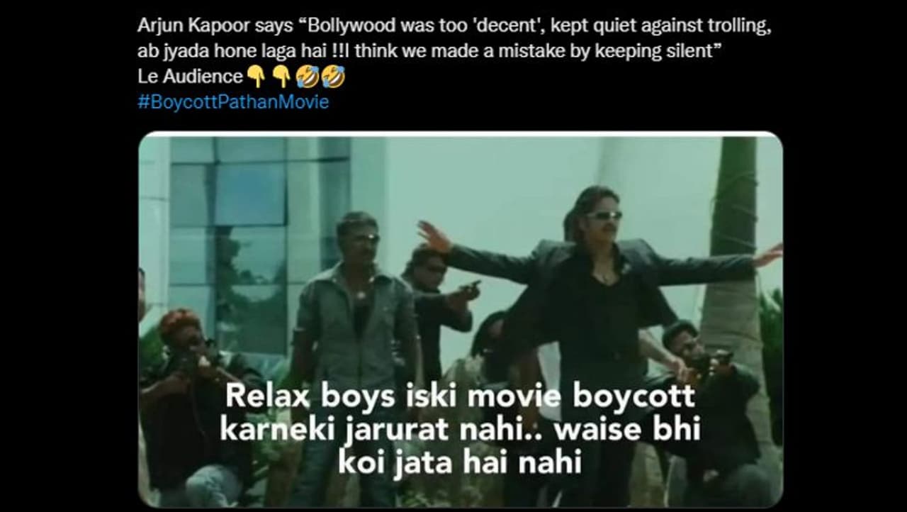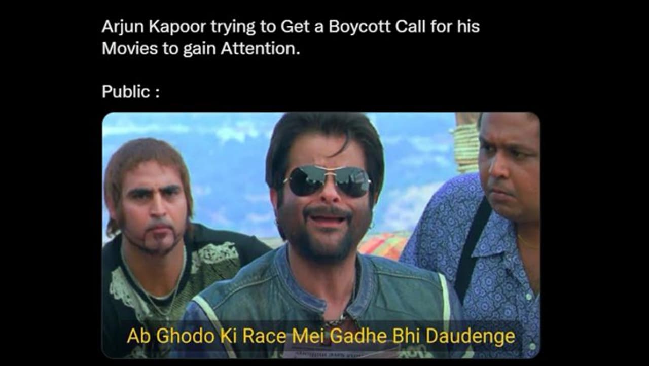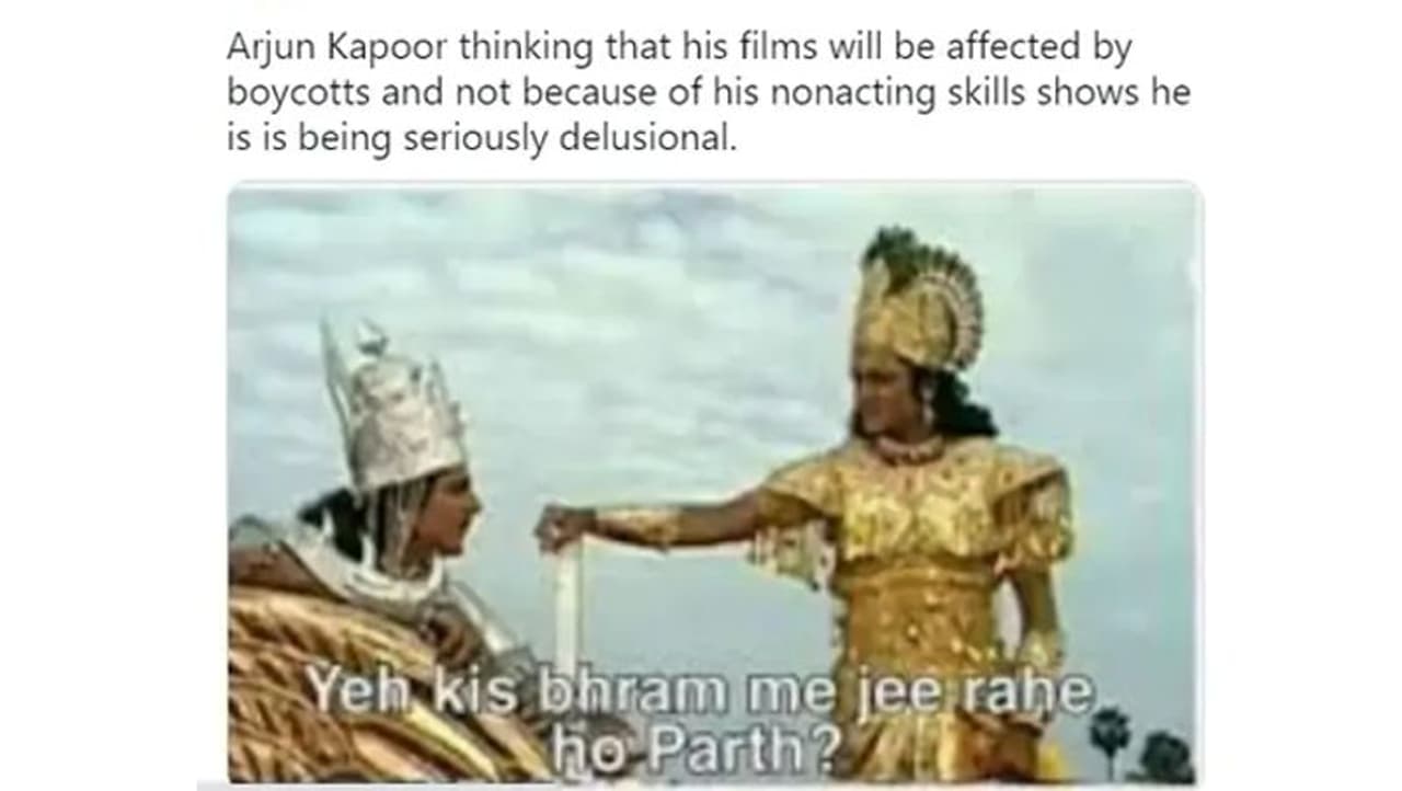 बॉलीवुड एक्टर अर्जुन कपूर ने जब से बॉयकॉट बॉलीवुड ट्रेंड पर बात की है तभी से वे खुद सोशल मीडिया ट्रोलर्स के निशाने पर आ गए हैं। बुधवार को अर्जुन दिन भर ट्रेंड करते रहे और उन्हें लेकर सोशल मीडिया यूजर्स ने कई मजेदार मीम्स भी शेयर किए। यहां देखें अर्जुन पर बने कुछ मजेदार मीम्स...
