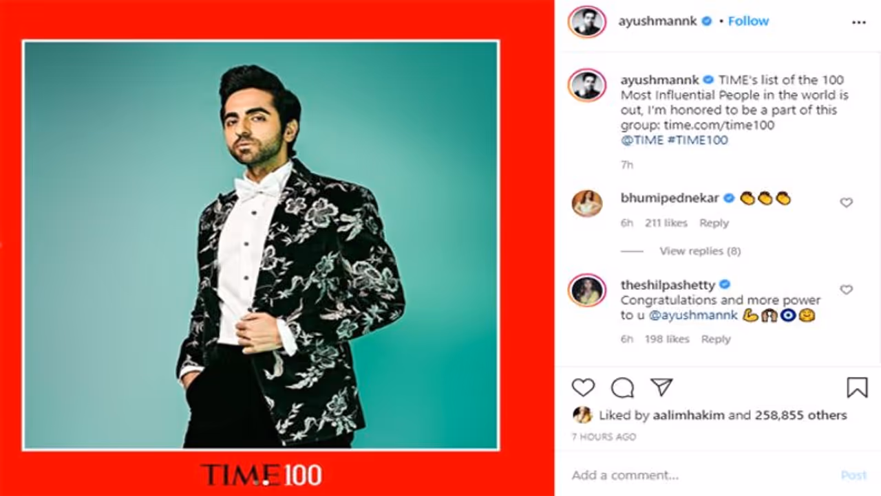 आयुष्मान को टाइम मैगजीन ने साल 2020 के टॉप 100 सबसे प्रभावशाली लोगों की लिस्ट में शामिल किया है। इस साल की Time 100 Most Influential List में शामिल होने वाले वे एकमात्र एक्टर हैं। बता दें कि आयुष्मान ने साल 2012 में विकी डोनर के साथ अपने फिल्मी करियर की शुरुआत की थी।