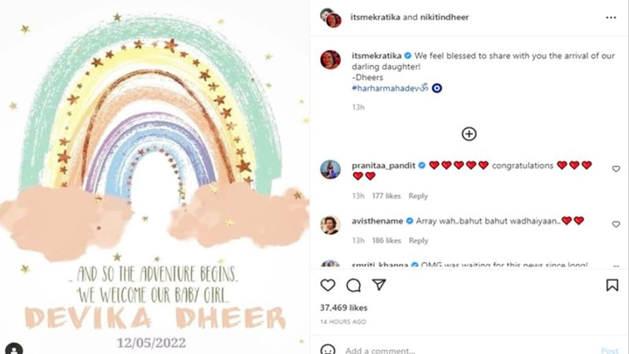 निकितन धीर और कृतिका सेंगर ने पोस्ट के साथ कैप्शन में लिखा है, "हमें अपनी प्यारी बेटी के आगमन की जानकारी आपके साथ साझा करते हुए बेहद गर्व महसूस हो रहा है। हर हर महादेव ॐ।"