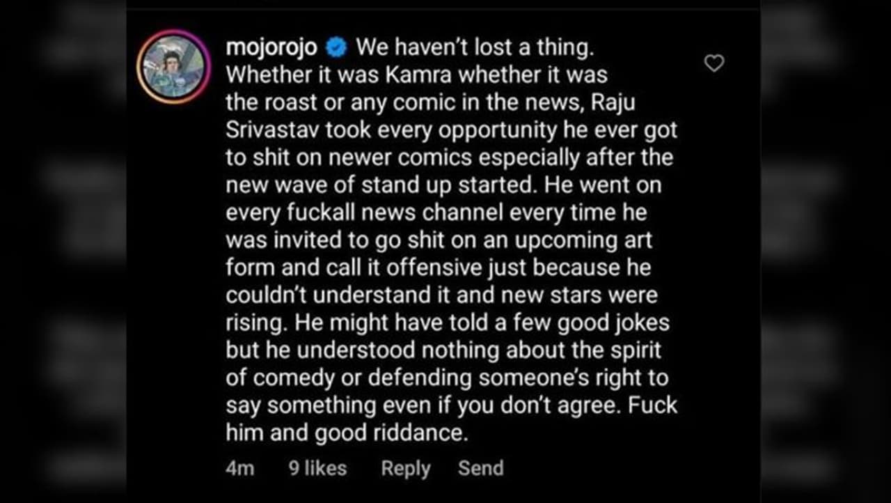 स्टैंडअप कॉमेडियन रोहन जोशी ने बुधवार को राजू श्रीवास्तव की मौत के बाद सोशल मीडिया पर आपतिजनक पोस्ट लिखी थी और इसे कर्मों का फल बताया था। उन्होंने राजू को श्रद्धांजलि देने वाली यूट्यूबर अतुल खत्री की पोस्ट पर कमेंट करते हुए लिखा था, "हमने कुछ नहीं खोया है। चाहे वह कामरा हो, चाहे वह रोस्ट हो या फिर न्यूज में कोई कॉमिक, राजू श्रीवास्तव ने हर मौके का फायदा उठाया। खासकर स्टैंडअप कॉमेडी की लहर शुरू होने के बाद।"