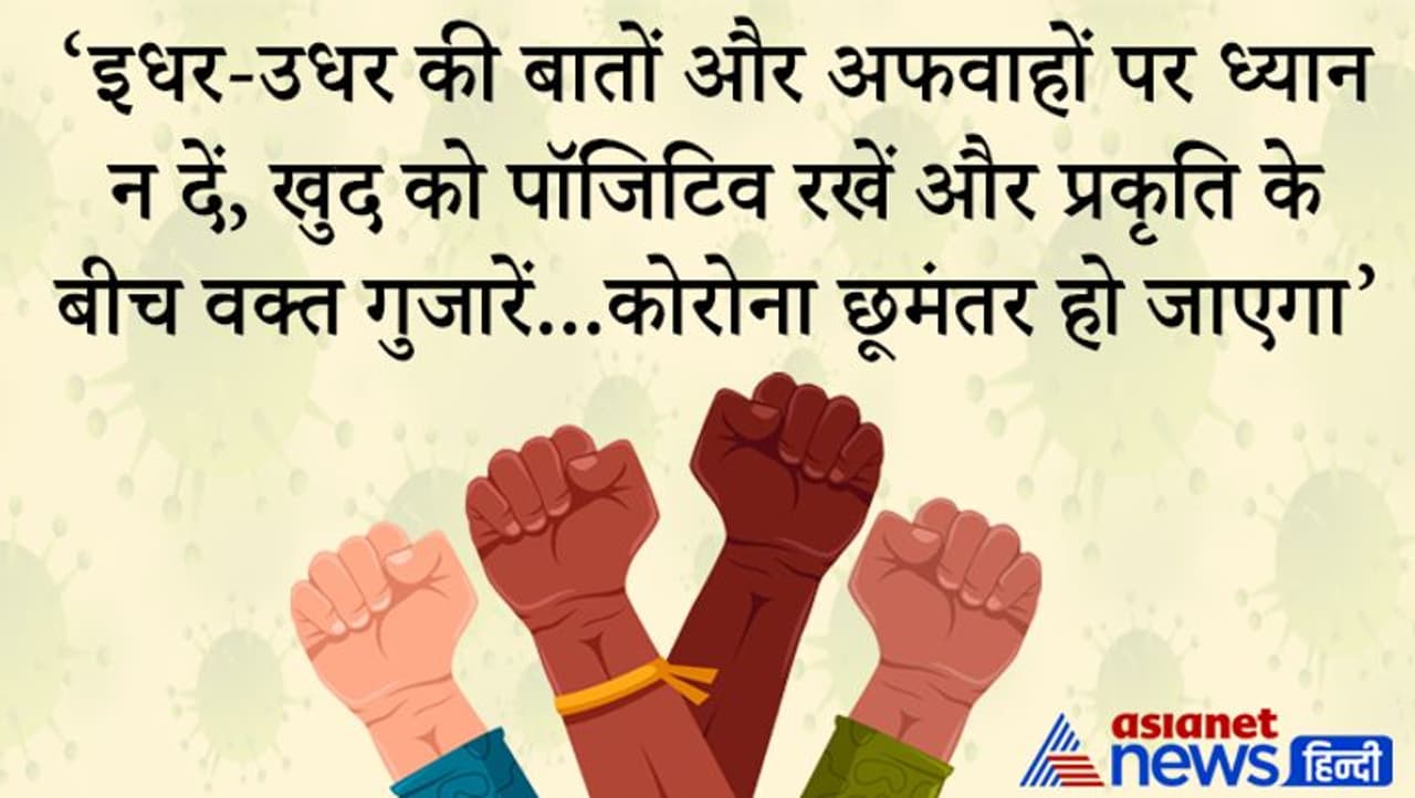 इधर-उधर की बातों और अफवाहों पर ध्यान न दें, इससे नकारात्मकता बढ़ती है। कुछ दिनों के लिए वाट्सएप, फेसबुक और टीवी से दूर हो जाएं। खुद को पॉजिटिव रखने के लिए ज्यादा से ज्यादा वक्त प्रकृति के बीच गुजारें, अपनी पसंद की चीजें करें। कोरोना छूमंतर हो जाएगा...।