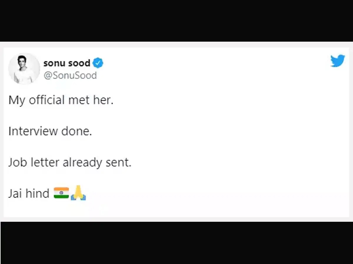 एक ट्विटर यूजर ने सोनू से ट्वीट करके मदद मांगी और कहा कि शारदा नाम की लड़की जो कि एक इंजिनियर है, उसकी जॉब लॉकडाउन में चली गई है। इसके बाद शारदा ने अपने परिवार की मदद के लिए सब्जियां बेचना शुरू कर दिया था। अब सोनू सूद ने ट्विटर पर जानकारी दी है कि जल्द ही शारदा दोबारा नौकरी करने लगेंगी। सोनू सूद ने ट्विटर पर लिखा, 'मेरे अधिकारी उनसे मिल चुके हैं। इंटरव्यू हो चुका है। उन्हें जॉब लेटर भेजा जा चुका है। जय हिंद।'