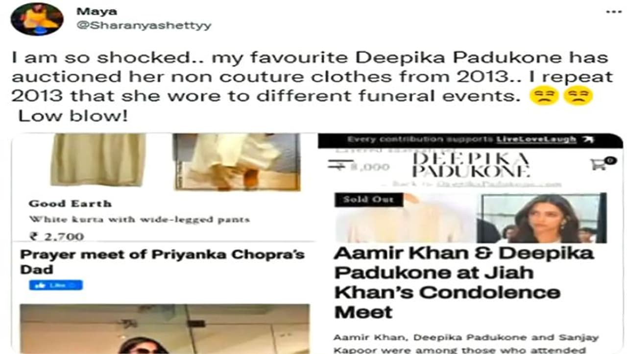 सोशल मीडिया यूजर ने कहा- मैं हैरान हूं कि मेरी फेवरेट एक्ट्रेस दीपिका पादुकोण ने 2013 के कुछ उन कपड़ों को नीलाम करने का फैसला किया है जिन्हें वो 2013 में दो अलग-अलग अंतिम संस्कारों में पहन चुकी हैं। हद हो गई। वहीं इस पर एक और शख्स ने कमेंट करते हुए लिखा- सेकंड हैंड कपड़े और जूते भला कौन खरीदेगा? इससे अच्छा तो इन्हें नीलाम करने के बजाए किसी जरुरतमंद को दे देतीं। अब ये कहते हुए जस्टिफाई मत करना कि ऐसा तुम चैरिटी के लिए कर रही हो।