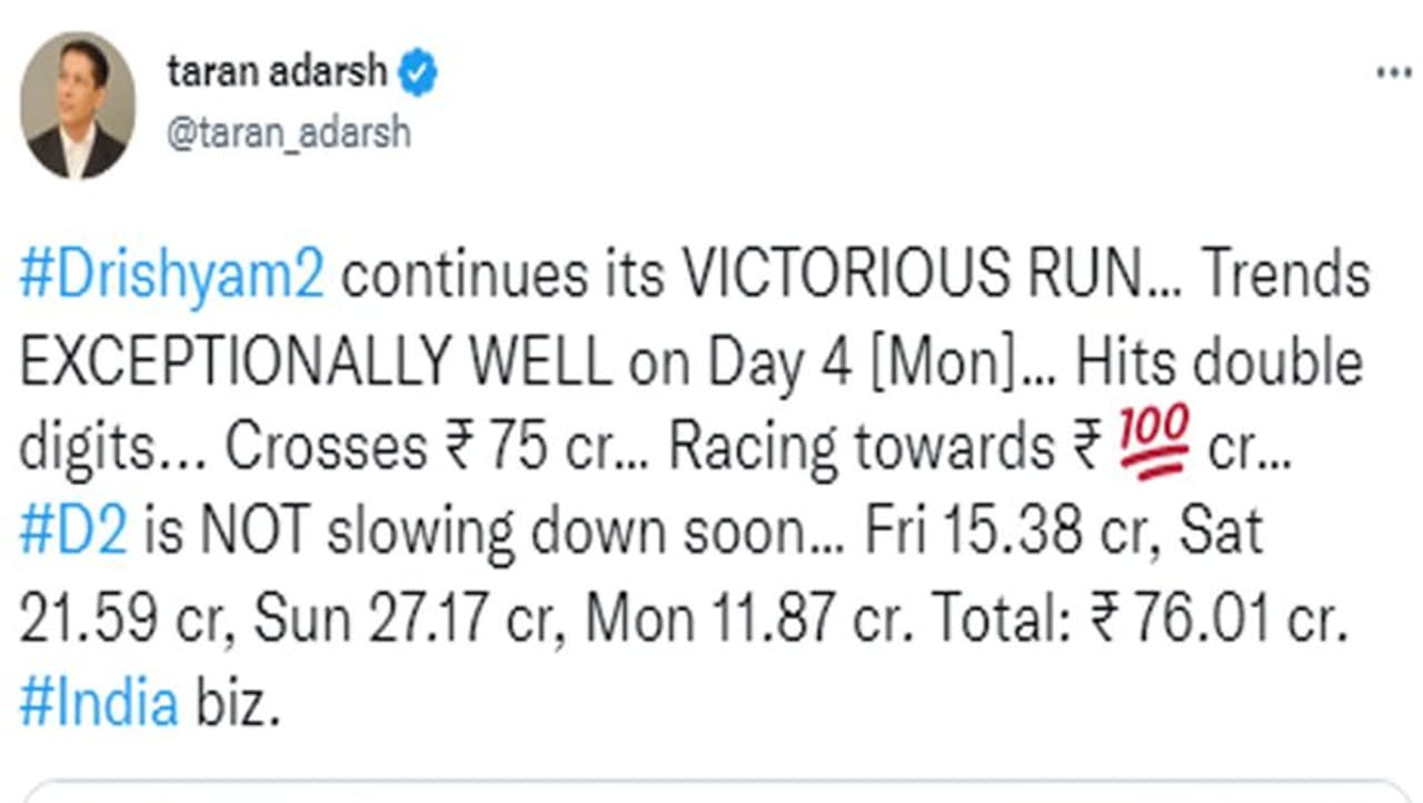 फिल्म के कलेक्शन की जानकारी देते हुए ट्रेड एनालिस्ट तरन आदर्श ने अपने ट्वीट में लिखा है, "दृश्यम 2 का विजय अभियान जारी है। चौथे दिन (सोमवार) के ट्रेंड्स असाधारण रूप से बेहतर रहे। डबल डिजिट को छुआ। 75 करोड़ का आंकड़ा पार।100 करोड़ की ओर दौड़ रही। दृश्यम 2 जल्दी ही धीमी नहीं होने वाली। शुक्रवार को 15.38 करोड़, शनिवार को 21.59 करोड़, रविवार को 27.17 करोड़, सोमवार को 11.87 करोड़ रुपए कमाए, टोटल कलेक्शन 76.01 करोड़ रुपए हुआ।"