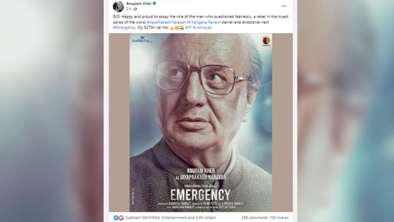 एंटरटेनमेंट डेस्क. कंगना रनोट (Kangana Ranaut) स्टारर अपकमिंग फिल्म 'इमरजेंसी' (Emergency) में अनुपम खेर (Anupam Kher) की भूमिका सामने आ गई है। वे इस फिल्म में लोकनायक के रूप में प्रसिद्ध राजनेता जयप्रकाश नारायण (Jayaprakash Narayan) का किरदार निभाएंगे। इस बात की जानकारी खुद अनुपम खेर ने सोशल मीडिया पर दी है। उन्होंने फिल्म से अपना फर्स्ट लुक साझा करते हुए लिखा है, "कंगना रनोट स्टारर और डायरेक्टेड 'इमरजेंसी' में निडर होकर सवाल करने वाले, सही मायनों में एक विद्रोही जयप्रकाश नारायण की भूमिका निभाते हुए हर्ष और गर्व महसूस हो रहा है।"