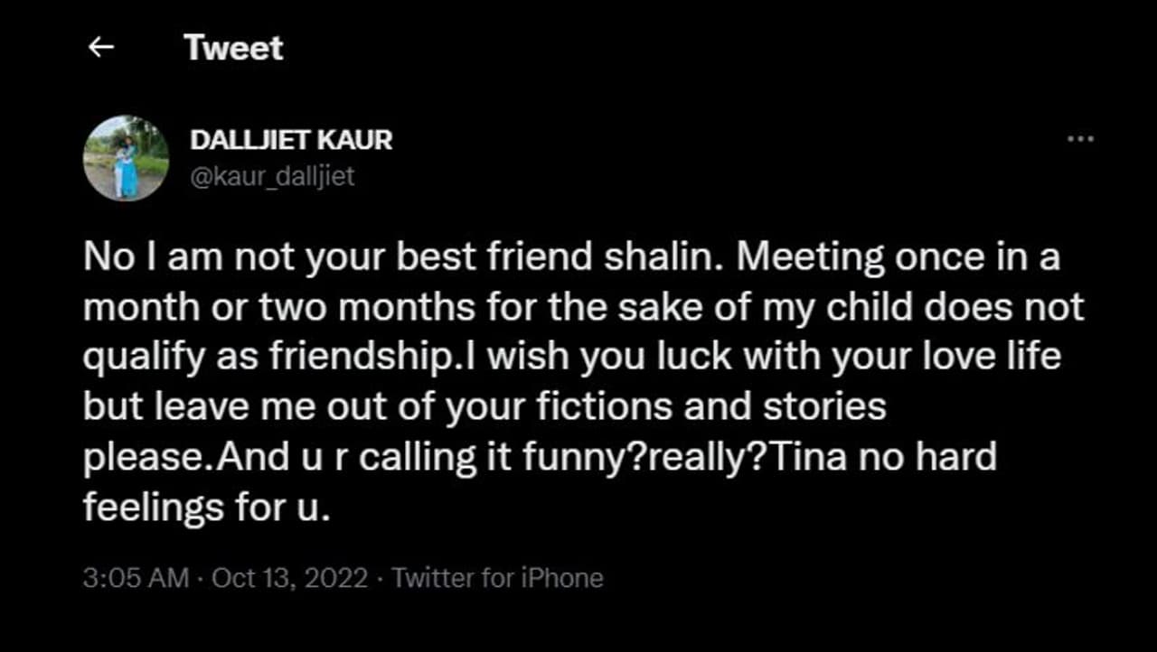 अब शालीन के इस बयान पर उनकी एक्स वाइफ और एक्ट्रेस दलजीत कौर (Dalljiet Kaur) का रिएक्शन आया है। उन्होंने ट्वीट कर अपनी भड़ास निकालते हुए शालीन को चेतावनी तक दे डाली है। दलजीत कौर ने लिखा, 'नहीं, मैं तुम्हारी बेस्ट फ्रेंड नहीं हूं शालीन। बच्चे के लिए महीने में एक या दो दिन मिलना दोस्ती नहीं कहलाता। तुम्हारी लव लाइफ के लिए मेरी शुभकामनाएं हैं लेकिन अपने झूठ और कहानियों से मुझे दूर रखो। तुम इसे फनी बता रहे हो? सच में? टीना तुम्हारे लिए मेरे मन में कोई बुरी फीलिंग नहीं हैं।'