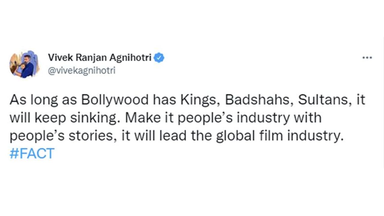 विवेक ने अपने ट्विटर अकाउंट पर ट्वीट करते हुए लिखा, 'जब तक बॉलीवुड में ये किंग, बादशाह और सुल्तान रहेंगे, तब तक हिंदी सिनेमा डूबते रहेगा। यदि आप लोगों की कहानी के सहारे इसे लोगों की इंडस्ट्री बनाएंगे, तभी यह ग्लोबल फिल्म इंडस्ट्री को लीड कर पाएगी। यह फैक्ट है।'