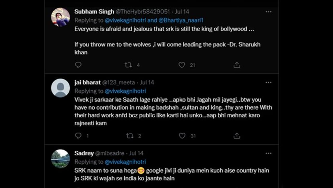 5. 'शाहरुख ने तो जरूरत पड़ने पर अपनी जेब से निकालकर दे दिया। क्या विवेक अग्निहोत्री ने कश्मीर फाइल्स की कमाई का पैसा उन कश्मीरी ब्राह्मणों को बांटा? भाई ट्वीट करके धर्म की राजनीति करने और रियल लाइफ में जेब ढ़ीली करने में बहुत फर्क होता है।'
