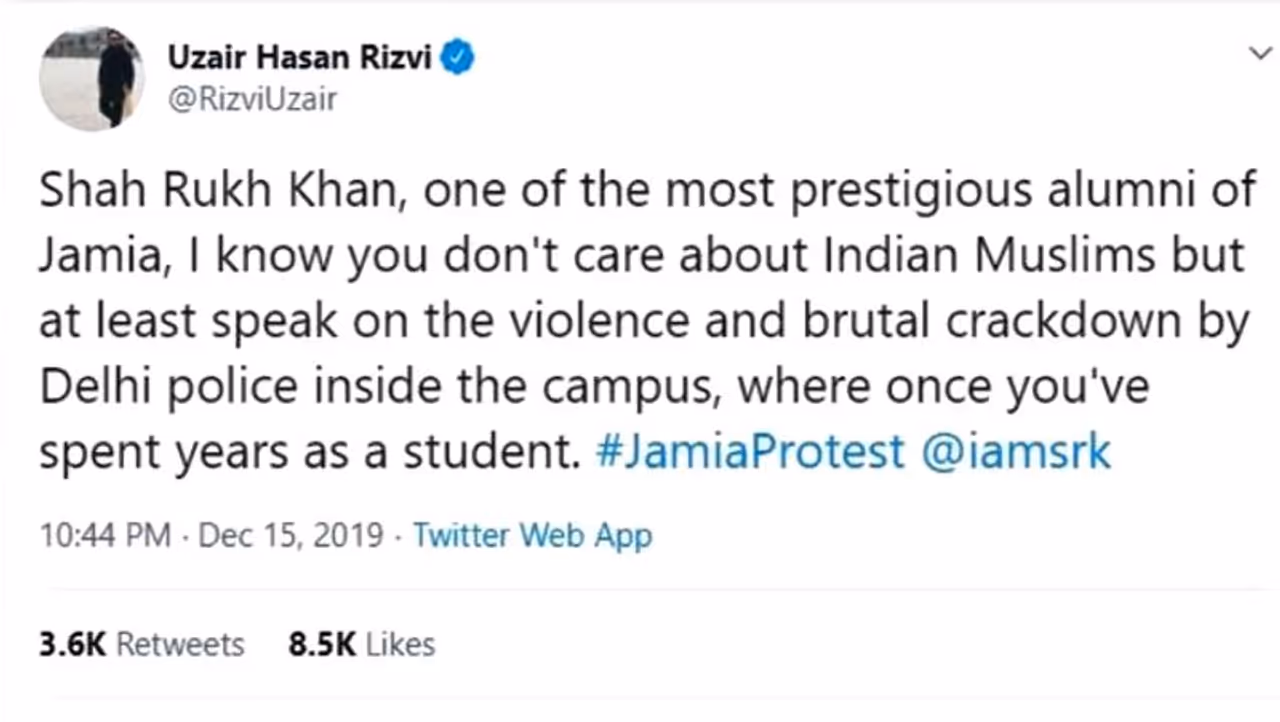 वहीं, उजैर हसन रिजवी नाम के एक और शख्स ने लिखा- ''शाहरुख, आप जामिया के सबसे अनमोल एलुमिनाइ में से एक हैं। मैं जानता हूं कि आपको भारतीय मुसलमानों की परवाह नहीं लेकिन कम से कम यूनिवर्सिटी कैंपस में दिल्ली पुलिस द्वारा की गई हिंसा और बर्बरता पर तो कुछ कह देते, आखिर आपने भी यहां स्टूडेंट के तौर पर कई साल गुजारे हैं।''