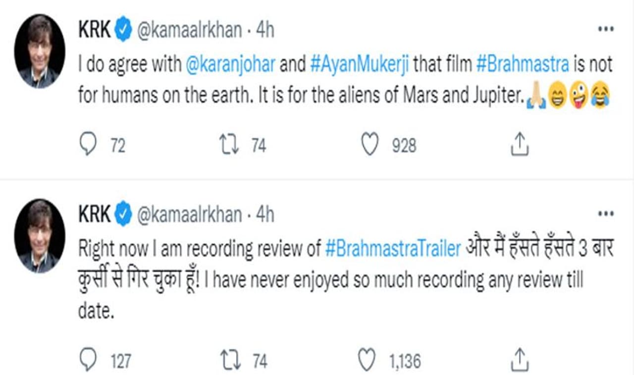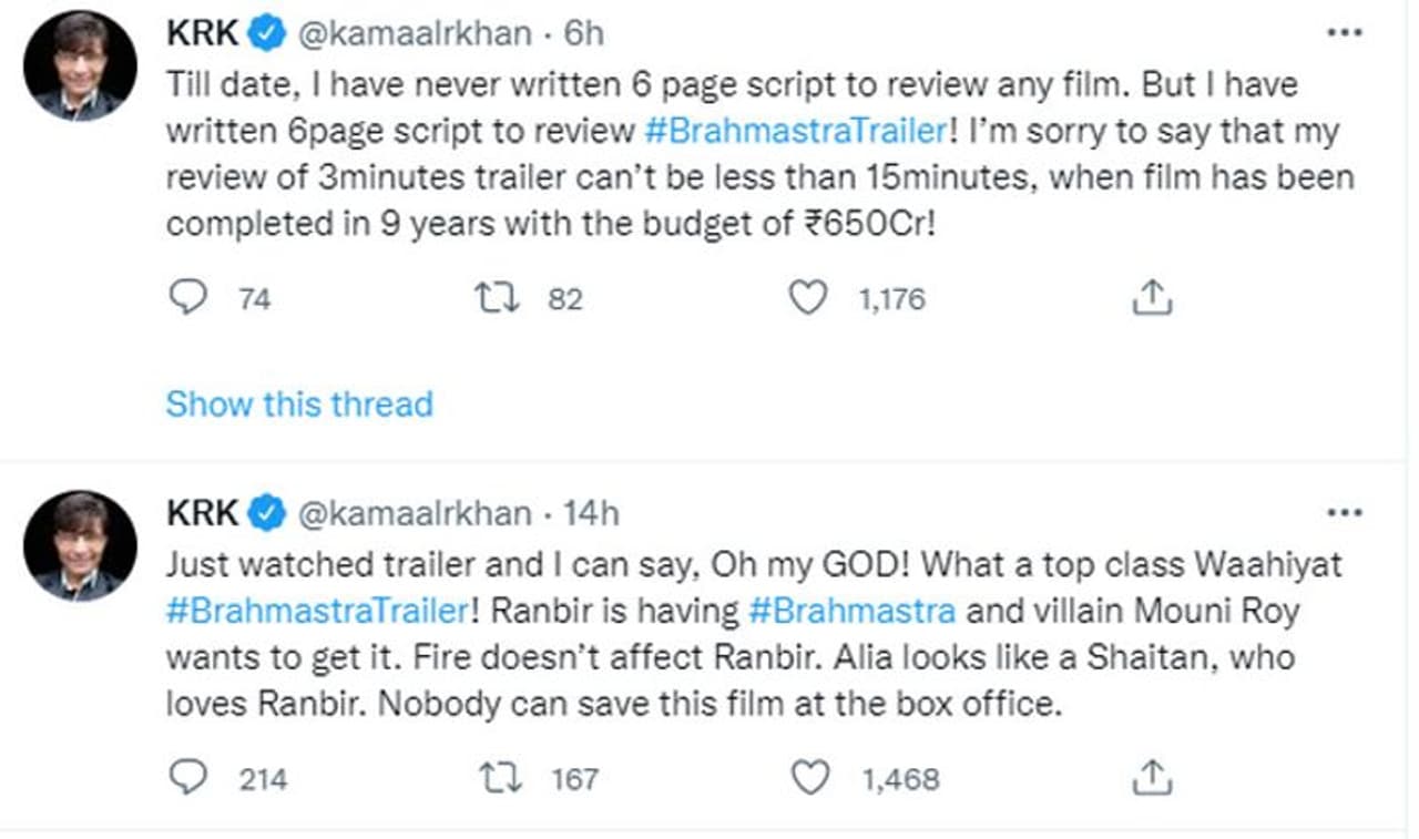 ‘ब्रह्मास्त्र’ के ट्रेलर को देखने केकेआर ने एक के बाद एक कई ट्वीट्स किए। उन्होंने लिखा,' अभी ट्रेलर देखा और मैं क्या कह सकता हूं, हे भगवान! ब्रह्मास्त्र का ट्रेलर क्या टॉप क्लास वाहियात है। रणबीर कपूर के पास ब्रह्मास्त्र है और विलेन मौनी रॉय इसे पाना चाहती है।आग रणबीर कपूर को नहीं जलाती है।आलिया शैतान की तरह दिखती है, जो रणबीर से प्यार करती है। इस फिल्म को बॉक्स ऑफिस पर कोई नहीं बचा सकता।'