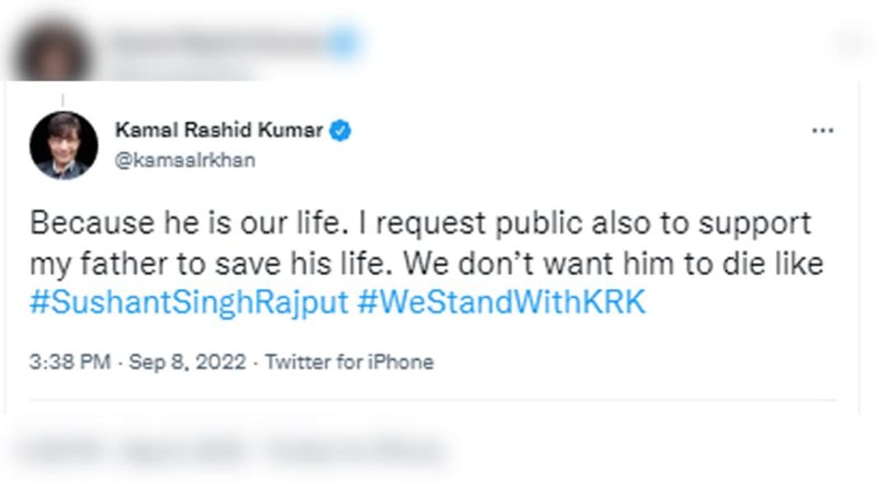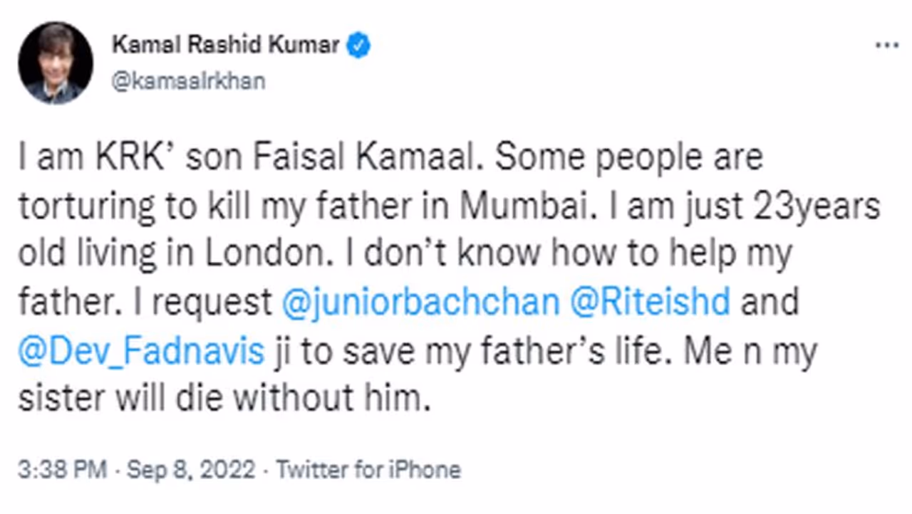 केआरके के ट्विटर हैंडल से किए गए ताजा ट्वीट में लिखा है, "मैं केआरके का बेटा फैजल खान। कुछ लोग मुंबई में मेरे पिता को मारने के लिए प्रताड़ित कर रहे हैं। मैं सिर्फ 23 साल का हूं और लंदन में रहता हूं। मुझे नहीं पता कि मैं अपने पिता की मदद कैसे करूं। मैंने अभिषेक बच्चन, रितेश देशमुख और देवेन्द्र फडणवीस से अपने पिता की जिंदगी बचाने की गुहार लगाई है।"