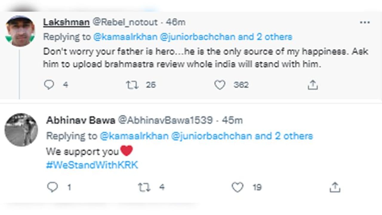 केआरके के बेटे फैजल के ट्वीट के समर्थन में कई लोगों ने ट्वीट किए हैं। मसलन एक यूजर ने लिखा है, "चिंता मत करो, तुम्हारे पिता हीरो हैं। मेरी ख़ुशी का एकमात्र जरिया हैं। उन्हें ब्रह्मास्त्र का रिव्यू अपलोड करने को कहो, पूरा भारत उनके साथ है।" एक अन्या यूजर ने लिखा है, "हम तुम्हारे साथ हैं।"