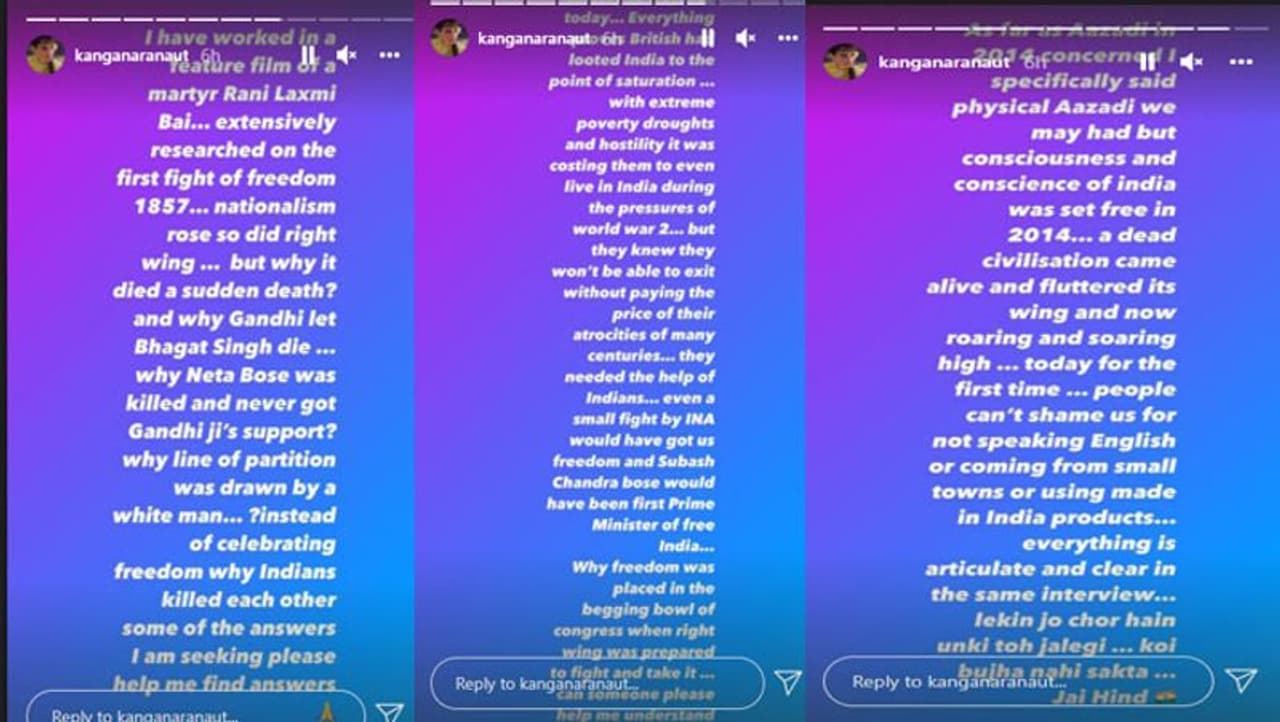 कंगना ने लंबे पोस्ट लिखकर विरोधियों को जवाब दिया। उन्होंने आगे कहा कि आखिर क्यों बंटवारे की रेखा एक अंग्रेज के द्वारा खींची गई? आजादी की खुशियां मनाने के बजाय भारतीय एक दूसरे को मार रहे थे। मुझे ऐसे कुछ सवालों के जवाब चाहिए जिसके लिए मुझे मदद की जरूरत है।