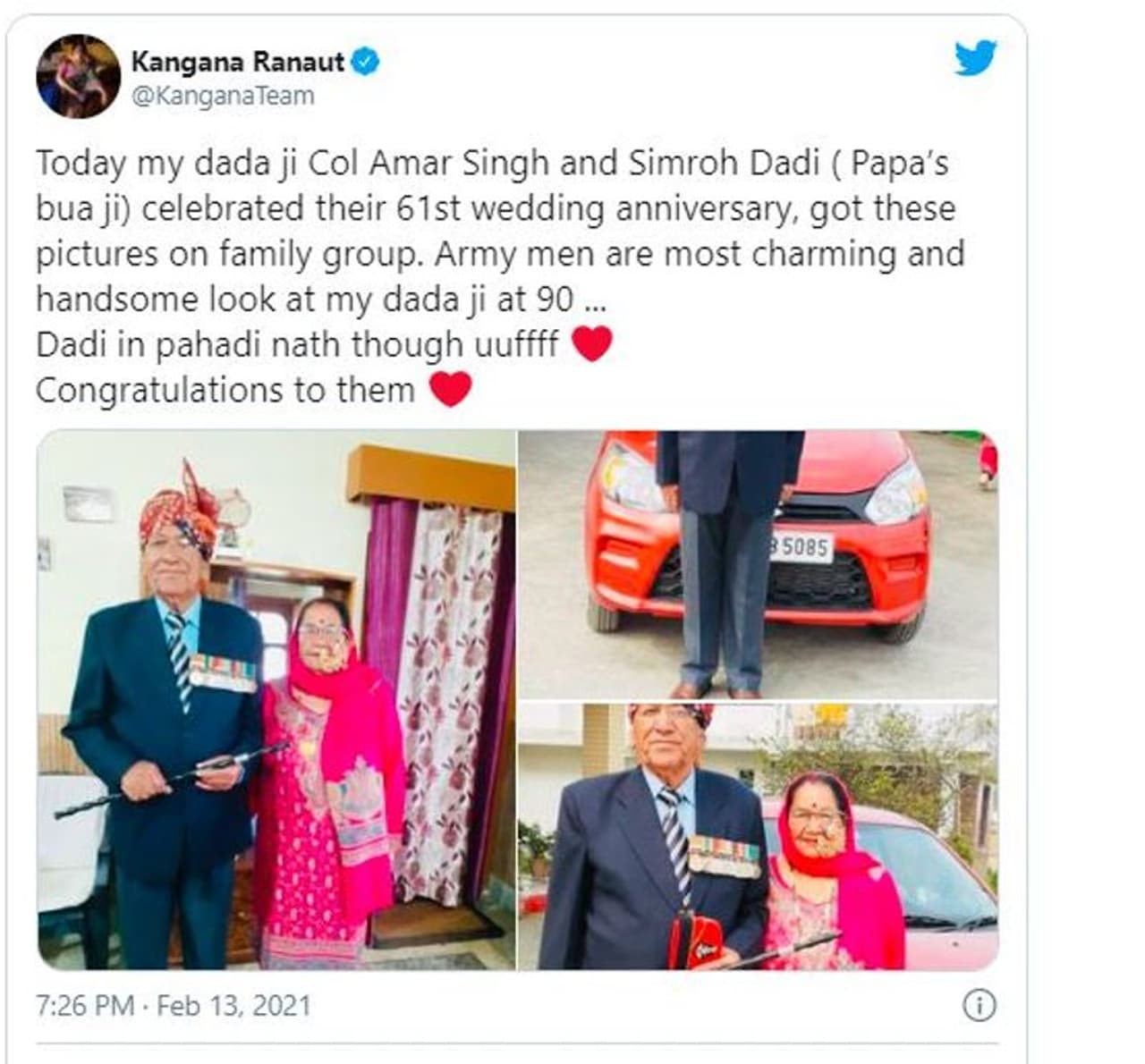 कंगना रनोट ने 13 फरवरी को एक पोस्ट शेयर की थी, जिसे शेयर करने के साथ ही उन्होंने लिखा, 'आज मेरे दादाजी कर्नल अमर सिंह और सिमोह दादी (पापा की बुआजी) ने 61वीं वेडिंग ऐनिवर्सरी सेलिब्रेट की। फैमिली ग्रुप से ये तस्वीरें सामने आई हैं। आर्मी मेन बहुत चार्मिंग और हैंडसम होते हैं, मेरे 90 साल के दादाजी को देखिए... पहाड़ी नथ में दादी उफ्फ, दोनों को बधाई।'