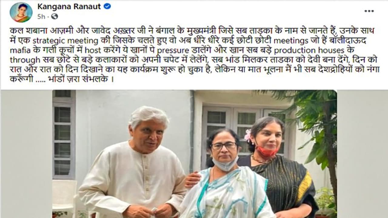 दरअसल, ममता बनर्जी ने दिल्ली दौरे पर जावेद अख्तर और उनकी पत्नी शबाना आजमी से नई दिल्ली में मुलाकात की थी। इस मुलाकात की तस्वीरें भी सोशल मीडिया पर खूब वायरल हुई थीं। कंगना रनोट ने इनकी मुलाकात को स्ट्रेटेजिक मीटिंग बताते हुए सोशल मीडिया पर कहा- कल शबाना आजमी और जावेद अख्तर जी ने बंगाल की मुख्यमंत्री, जिसे सब ताड़का (राक्षसी) के नाम से जानते हैं, के साथ एक स्ट्रेटेजिक मीटिंग की, जिसके चलते वो अब धीरे-धीरे कई छोटी-छोटी मींटिंग्स बॉलीदाऊद (बॉलीवुड) माफिया के गली कूचों में आयोजित करेंगे। ये खानों पर दबाव डालेंगे और खान सब बड़े प्रोडक्शन हाउस के जरिए सभी छोटे से बड़े कलाकारों को अपनी चपेट में ले लेंगे। कंगना यहीं नहीं रुकीं, उन्होंने आगे कहा कि सब मिलकर ताड़का को देवी बना देंगे, दिन को रात और रात को दिन दिखाने का ये कार्यक्रम शुरू हो चुका है। लेकिन ये मत भूलना कि मैं भी सभी देशद्रोहियों को नंगा करूंगी। जरा संभलके।