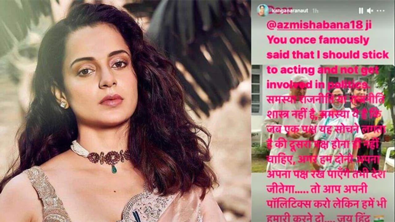 बता दें कि इससे पहले शबाना आजमी ने एक इंटरव्यू के दौरान कंगना को एक्टिंग पर ध्यान देने की सलाह दी थी। इस पर कंगना ने तंज कसते हुए कहा- आपने कहा था कि मुझे एक्टिंग पर ध्यान देना चाहिए और राजनीति में नहीं घुसना चाहिए। समस्या राजनीति या राजनीति शास्त्र नहीं है। समस्या ये है कि जब एक पक्ष सोचता है कि दूसरा पक्ष होना ही नहीं चाहिए। जब हम दोनों अपना-अपना पक्ष रखेंगे, तभी देश जीतेगा। तो आप अपनी पॉलिटिक्स करो और हमें हमारी करने दो। जय हिंद।