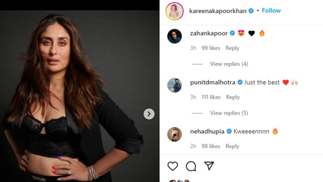 करीना की इस पोस्ट पर एक्ट्रेस नेहा धूपिया ने कमेंट कर 'क्वीन' लिखा है। वहीं इस पोस्ट पर कुणाल कपूर के बेटे और करीना के कजिन ब्रदर जहान कपूर ने भी हार्ट इमोजी बनाया है। इसके अलावा डायरेक्टर पुनीत मल्होत्रा ने लिखा, 'जस्ट द बेस्ट'।