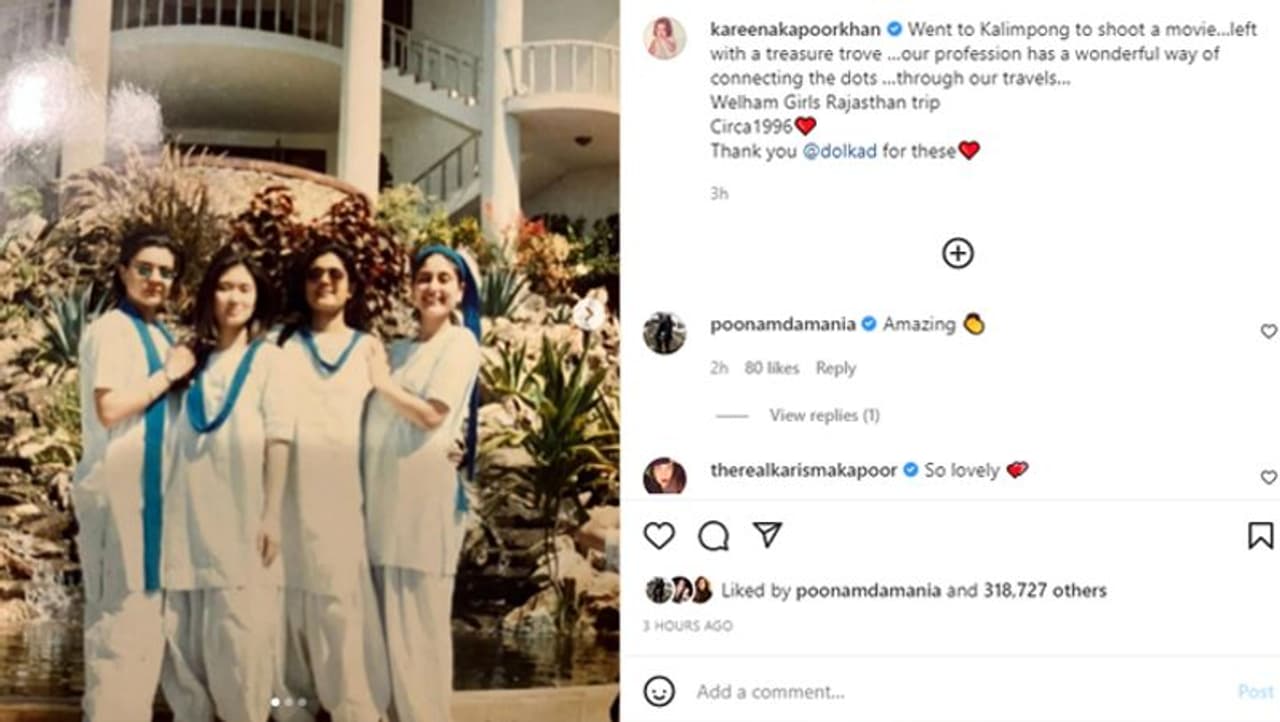 फोटो में करीना अपनी तीन सहेलियों के साथ नज़र आ रही हैं। उन्होंने इसके कैप्शन में लिखा है, "एक फिल्म की शूटिंग के लिए कलिम्पोंग में हूं...इसे एक खजाने के साथ छोड़ा। हमारा पेशा बिन्दुओं को जोड़ने का शानदार तरीका है। हमारी यात्रा के माध्यम से। वेल्हम गर्ल्स राजस्थान ट्रिप। लगभग 1996। धन्यवाद।"
