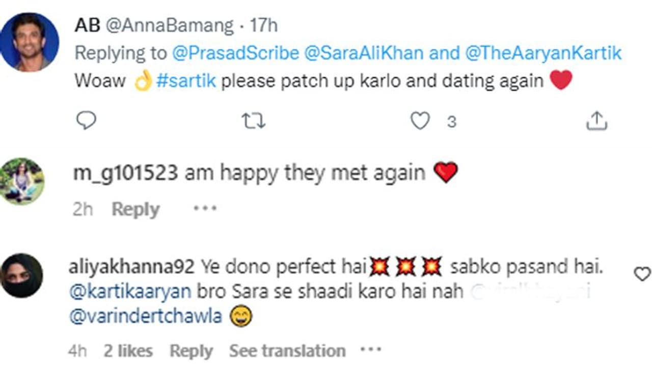 कार्तिक और सारा का वीडियो देखने के बाद एक सोशल मीडिया यूजर ने लिखा है, "Waw! सार्तिक (Sartik)। प्लीज पैचअप कर लो और फिर से डेट करने लगो।" एक अन्य यूजर का कमेंट है, "ये दोनों परफेक्ट हैं। सबको पसंद हैं। कार्तिक आर्यन भाई सारा से शादी करो।" एक यूजर का कमेंट हैं, "खुश हूं कि वे दोबारा मिल गए।"