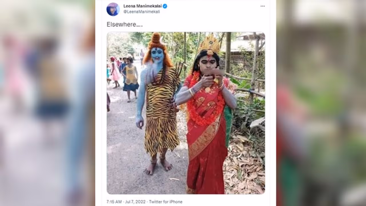 एंटरटेनमेंट डेस्क. अपनी डॉक्युमेंट्री 'काली' (Kaali) के पोस्टर में माता काली को सिगरेट पीते और हाथ में LGBT कम्युनिटी का झंडा थामे दिखाने के बाद लीना मणिमेकलाई (Leena Manimekalai) ने ट्विटर पर नई विवादित फोटो शेयर की है, जिसमें अब उन्होंने भगवान शिव और माता पार्वती के गेटअप में दो कलाकारों को सिगरेट पीते दिखाया है। इसके साथ उन्होंने कैप्शन में लिखा है, "Elsewhere." (कहीं और)। लीना की इस पोस्ट पर भी लोग नाराजगी जता रहे हैं।