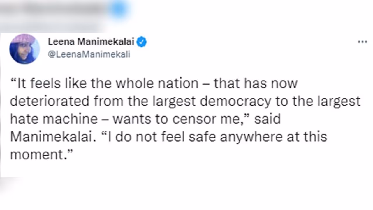 लीना ने एक अन्य ट्वीट में भारत को नफरत की मशीन बताया है। उन्होंने लिखा है, "ऐसा लगता है कि पूरा देश जो अब सबसे बड़े लोकतंत्र से सबसे बड़ी नफरत की मशीन बन गया है, मुझे सेंसर करना चाहता है। मैं इस समय कहीं भी सुरक्षित महसूस नहीं कर रहा हूं।"