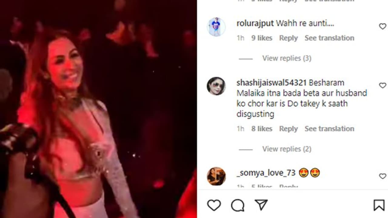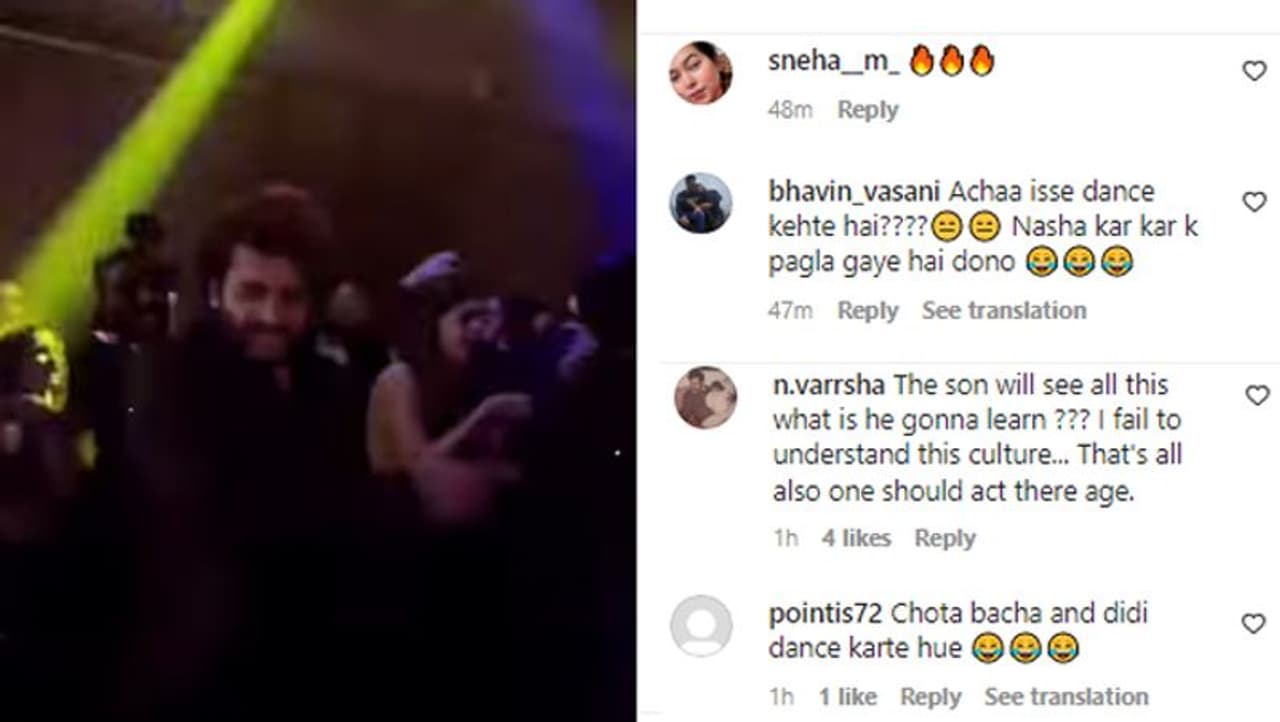 एक यूजर का कमेंट है, "बेटा यह सब देखेगा तो वह क्या सीखेगा? इस कल्चर को समझ पाने में असमर्थ हूं। उन्हें अपनी उम्र के हिसाब से एक्टिंग करनी चाहिए।" एक यूजर ने पूछा है, "अच्छा इसे डांस करते हैं? नशा कर-कर के पगला गए हैं दोनों।" कई लोगों ने अर्जुन और मलाइका की बीच की उम्र के अंतर की वजह से उन्हें निशाने पर लिया है। कुछ इंटरनेट यूजर्स ने मलाइका की तुलना अर्जुन की मां, कुछ ने आंटी तो कुछ ने दीदी से की है।