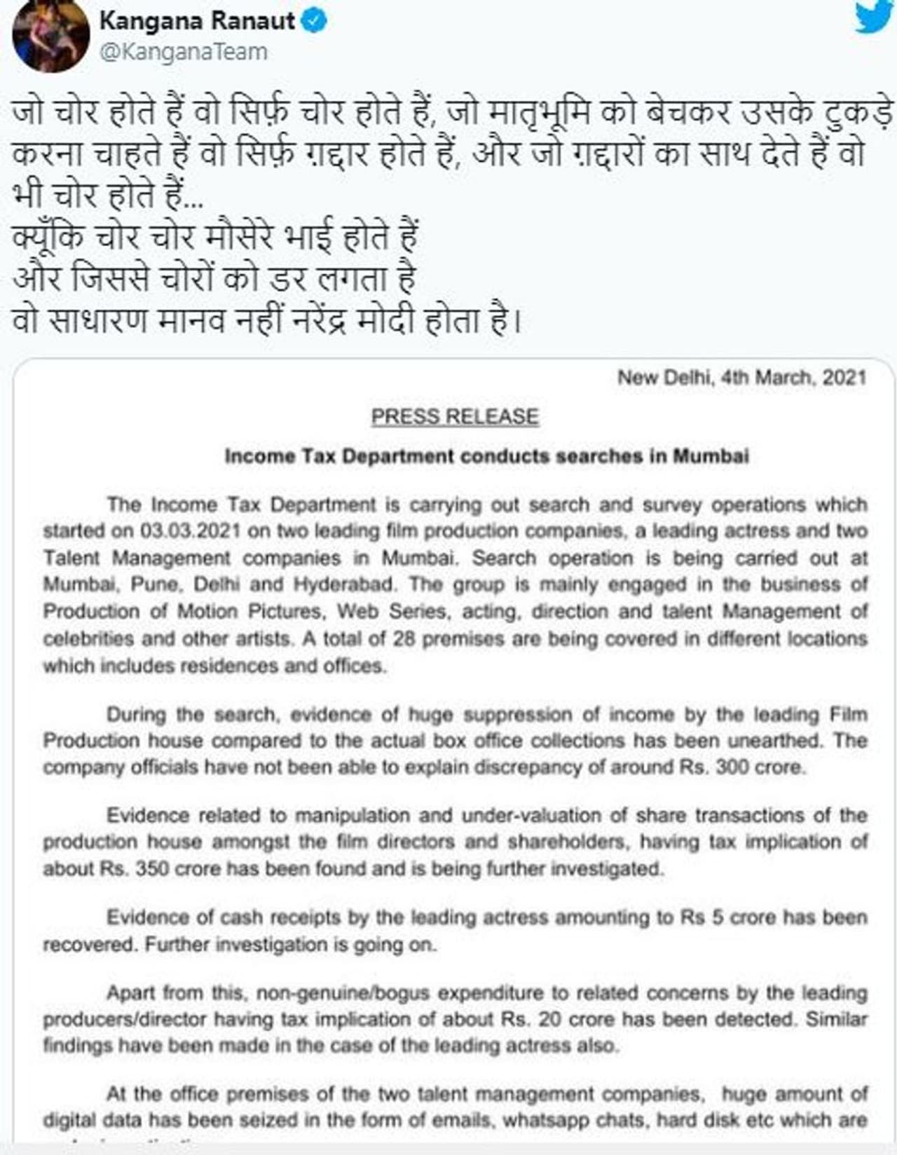 अनुराग कश्यप और तापसी पन्नू पर इनकम टैक्स विभाग की कार्रवाई पर कंगना रनोट ने ट्वीट किया और उन्होंने इसमें लिखा, 'जो चोर होते हैं वो सिर्फ चोर होते हैं, जो मातृभूमि को बेचकर उसके टुकड़े करना चाहते हैं वो सिर्फ गद्दार होते हैं, और जो गद्दारों का साथ देते हैं वो भी चोर होते हैं... क्योंकि चोर-चोर मौसेरे भाई होते हैं और जिससे चोरों को डर लगता है वो साधारण मानव नहीं नरेंद्र मोदी होता है।'