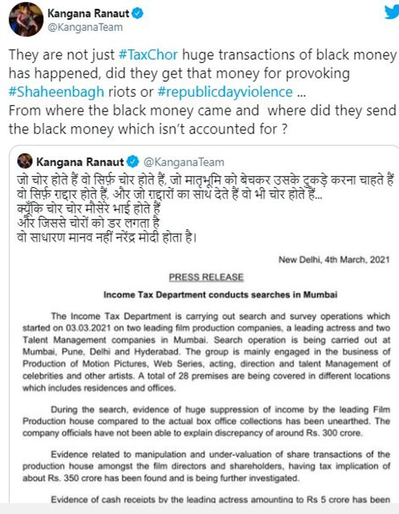 कंगना रनोट ने एक और ट्वीट किया। उसमें उन्होंने लिखा, 'ये सिर्फ टैक्सचोर नहीं बल्कि ब्लैक मनी का बहुत बड़ा लेन-देन हुआ है। क्या उन्हें शाहीनबाग दंगो या गणतंत्र दिवस हिंसा को भड़काने के लिए वह पैसा मिला था... ब्लैक मनी कहां से आई और कहां भेजी गई, जिसका कोई हिसाब नही है?'