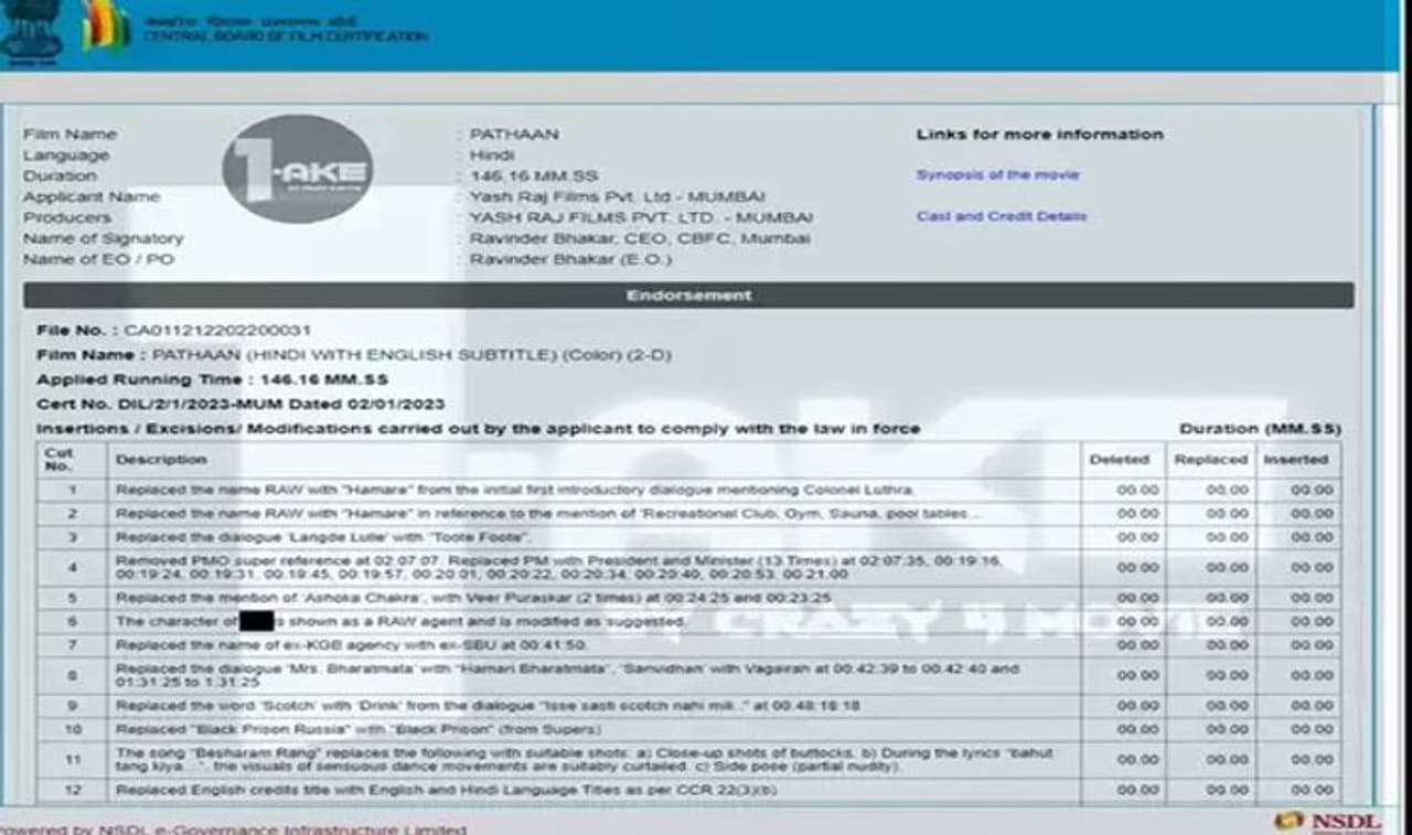 पठान मूवी में एक डायलॉग है जिसमें 'श्रीमती भारत माता' कहा जाता है। बोर्ड ने इसे बदलकर 'हमारी भारत माता' करने का सुझाव दिया है।