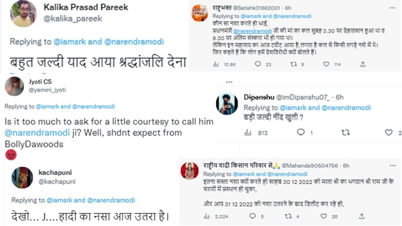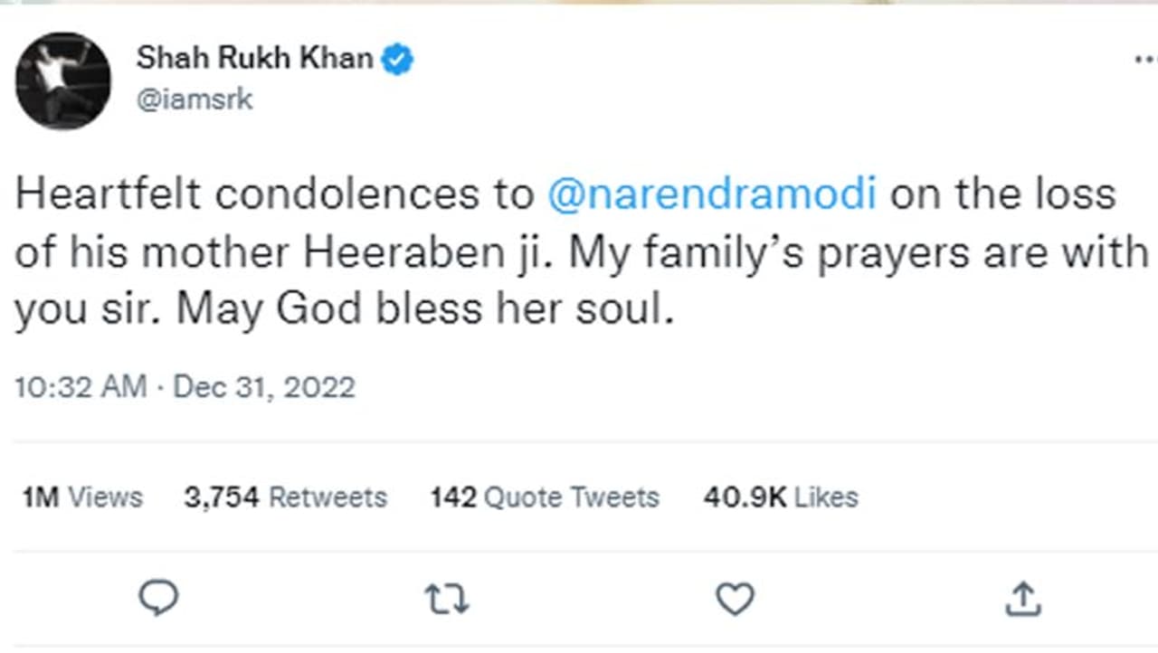 प्रधानमंत्री मोदी की मां का निधन शुक्रवार यानी 30 दिसंबर की सुबह 100 साल की उम्र में हुआ था। शाहरुख़ खान ने उन्हें श्रद्धांजलि देने में 24 घंटे से भी ज्यादा का वक्त लगाया। उन्होंने 31 दिसंबर की सुबह 10:32 बजे एक ट्वीट किया, जिसमें लिखा है, "नरेंद्र मोदी को उनकी मां हीरा बेन जी के खोने पर हार्दिक संवेदना। मेरे परिवार की प्रार्थनाएं आपके साथ हैं सर। ईश्वर उनकी आत्मा को शांति दे।"