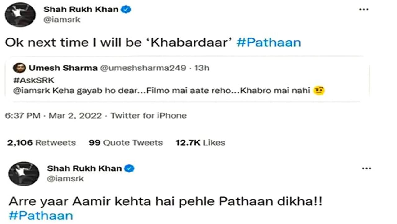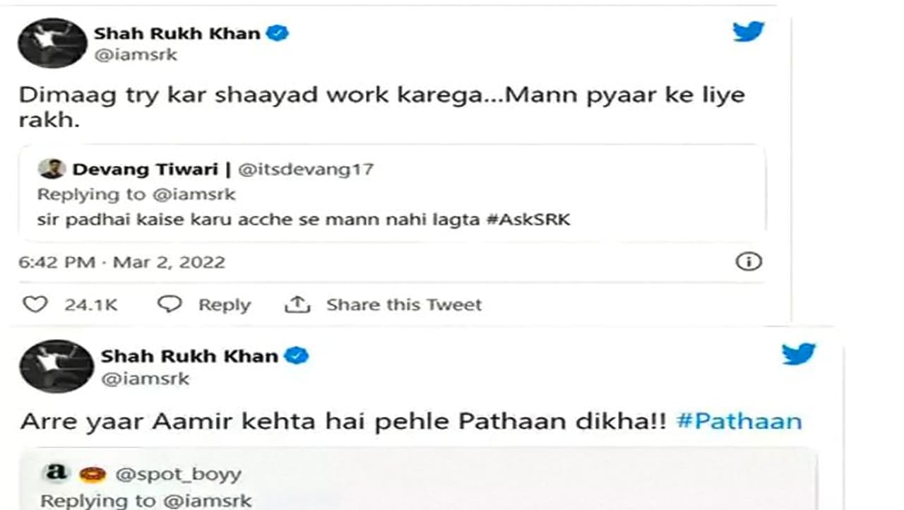 शाहरुख (Shahrukh Khan) के एक फैन ने उन्हें नसीहत देते हुए कहा- कहां गायब हो डियर, फिल्मों में आते रहो..खबरों में नहीं। इस नसीहत को ध्यान में रखते हुए शाहरुख खान ने भी उस शख्स को जवाब देते हुए लिखा- ओके अगली बार से मैं खबरदार रहूंगा। वहीं एक और शख्स ने शाहरुख (Shahrukh Khan) से पूछा- लाल सिंह चड्ढा देखी? इस पर शाहरुख खान ने जवाब देते हुए कहा- अरे यार आमिर कहता है पहले पठान दिखा। एक यूजर ने पूछा- इतने दिनों कहां गायब थे? इस पर शाहरुख ने कहा- खयालों में। वहीं एक शख्स ने पूछा- सर पढ़ाई कैसे करूं, अच्छे से मन नहीं लगता। इस पर शाहरुख बोले- दिमाग ट्राइ कर शायद काम करेगा, मन प्यार के लिए रख।