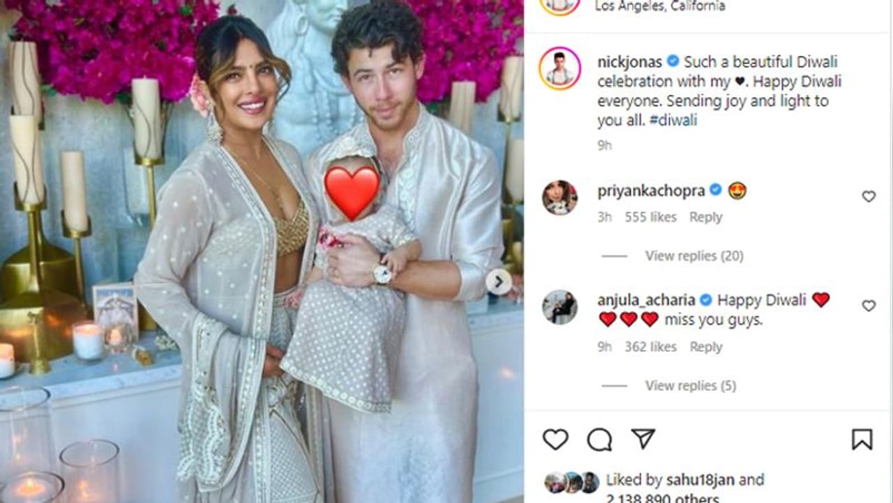 पहली तस्वीर में मालती मां प्रियंका की गोद में दिखाई दे रही हैं तो वहीं दूसरी तस्वीर में प्रियंका और निक पूजा कर रहे हैं और मालती एक्ट्रेस की गोद में बैठी हुई है और अपने पिता की उंगली पकड़े हुए हैं। हालांकि, दोनों तस्वीरों में निक ने हार्ट की इमोजी से मालती का चेहरा छुपा दिया है। फोटो शेयर करते हुए निक ने लिखा है, "अपने प्यार के साथ खूबसूरत दिवाली सेलिब्रेशन। सभी को दिवाली की हार्दिक शुभकामनाएं।" तस्वीरों पर प्रियंका चोपड़ा ने स्माइलिंग फेस विद हार्ट आइज वाली इमोजी साझा कर रिएक्ट किया है।