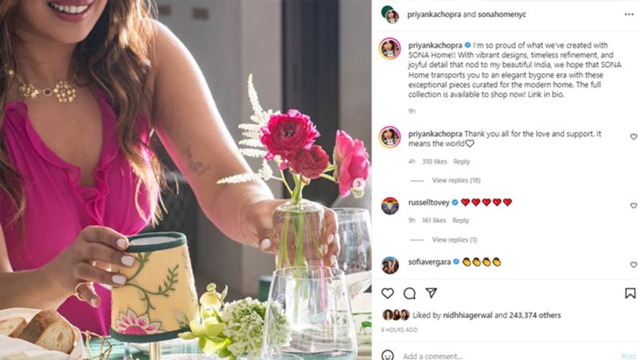 प्रियंका ने इसकी अगली पोस्ट में अपनने प्रोडक्ट की कुछ तस्वीरें साझा की हैं और लिखा है, "सोना होम के साथ हमने जो बनाया, उस पर मुझे गर्व है। जीवंत डिजाइन, टाइमलेस रिफाइनमेंट, और जॉयफुल डिटेल, जो मेरे खूबसूरत भारत की ओर इशारा करती करते हैं। हमें उम्मीद है कि सोना होम आपको आधुनिक घर के लिए तैयार किए गए इन असाधारण टुकड़ों के साथ एक सुंदर बीते युग में ले जाएगा। पूरा संग्रह अब खरीदारी के लिए उपलब्ध है।"