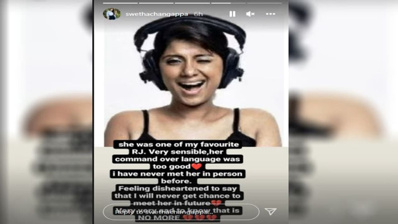 लोकप्रिय कन्नड़ अभिनेत्री स्वेता चेंगप्पा ने भी अपने इंस्टाग्राम हैंडल पर आरजे रचना की मौत के बारे में लिखा। अभिनेत्री ने सोशल मीडिया पर एक पोस्ट डाली, जिसमें उन्होंने लिखा,'वह मेरी पसंदीदा आरजे में से एक थीं। बहुत समझदार, भाषा पर उनकी पकड़ बहुत अच्छी थी। मैं उससे पहले कभी व्यक्तिगत रूप से नहीं मिला। यह कहते हुए निराशा हो रही है कि मुझे भविष्य में उनसे कभी मिलने का मौका नहीं मिलेगा। यह जानकर बहुत दुख हुआ कि यह अब नहीं है।'