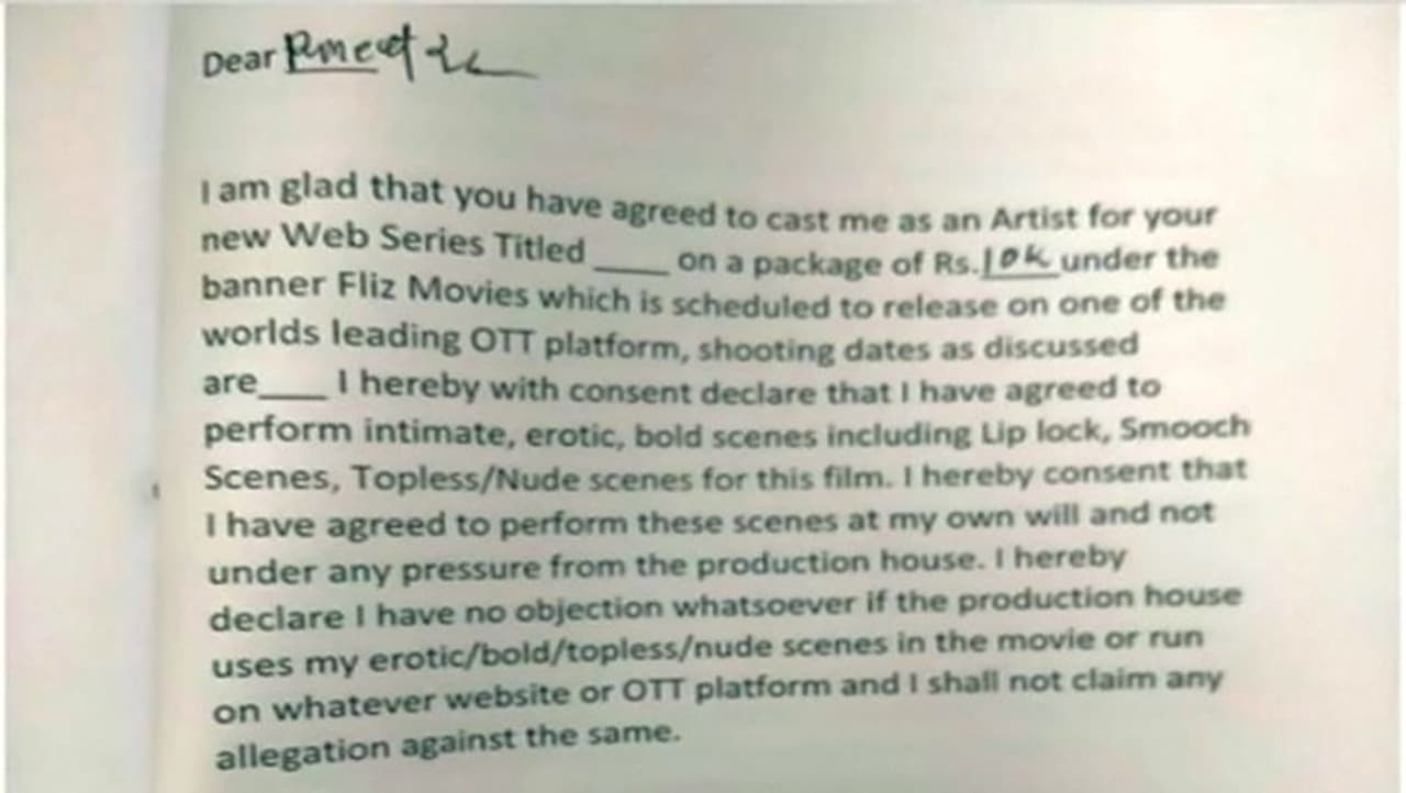 इस कॉन्ट्रैक्ट में लिखा है- मैं खुश हूं कि आपने मुझे बतौर आर्टिस्ट अपनी नई वेब सीरीज में 10 हजार के पैकेज में कास्ट किया। ये वेब सीरीज फ्लिज (Fliz) मूवीज के बैनर तले बनी है जो दुनिया के लीडिंग ओटीटी प्लेटफॉर्म पर रिलीज होने के लिए शेड्यूल है। शूटिंग डेट्स जिसपर बात हुई है वो.... हैं। अपनी मर्जी से मैं फिल्म में इंटीमेट, एरोटिक, बोल्ड सीन्स जिसमें लिप लॉक, स्मूच, टॉपलेस या न्यूड सीन्स करने का ऐलान करती हूं।