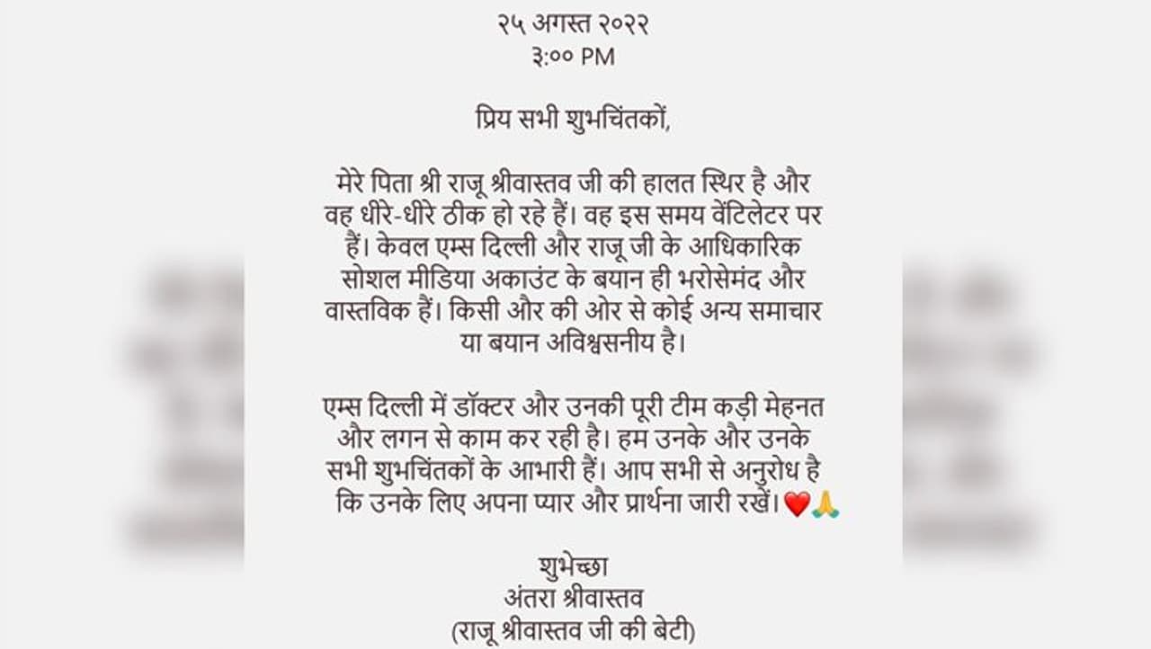 - 25 अगस्त को ही राजू श्रीवास्तव की बेटी अंतरा श्रीवास्तव ने आधिकारिक बयान जारी किया और कॉमेडियन के फैन्स से गुजारिश की कि वे परिवार और अस्पताल के डॉक्टर्स के अलावा किसी की बात पर यकीन ना करें। उन्होंने यह भी कहा कि राजू श्रीवास्तव की हालत स्थिर है, लेकिन वे अभी भी वेंटिलेटर पर हैं।