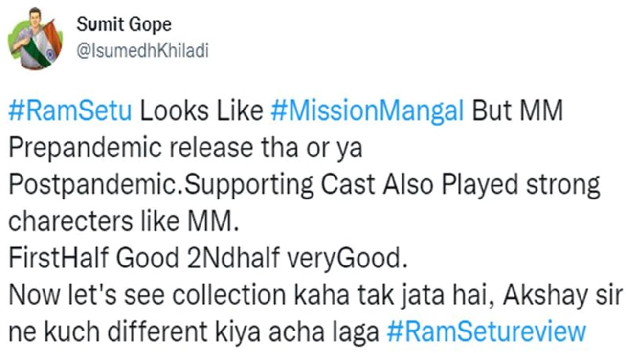 एक यूजर ने लिखा है, "राम सेतु' 'मिशन मंगल' की तरह दिखती है। लेकिन 'मिशन मंगल' महामारी से पहले रिलीज हुई थी और यह महामारी के बाद। मिशन मंगल की तरह सपोर्टिंग कास्ट ने भी मजबूती के साथ किरदार निभाए हैं। पहला हाफ अच्छा है, दूसरा हाफ बहुत अच्छा है। अब देखना यह है कि कलेक्शन कहां तक जाता है। अक्षय सर ने कुछ अलग किया, अच्छा लगा।"