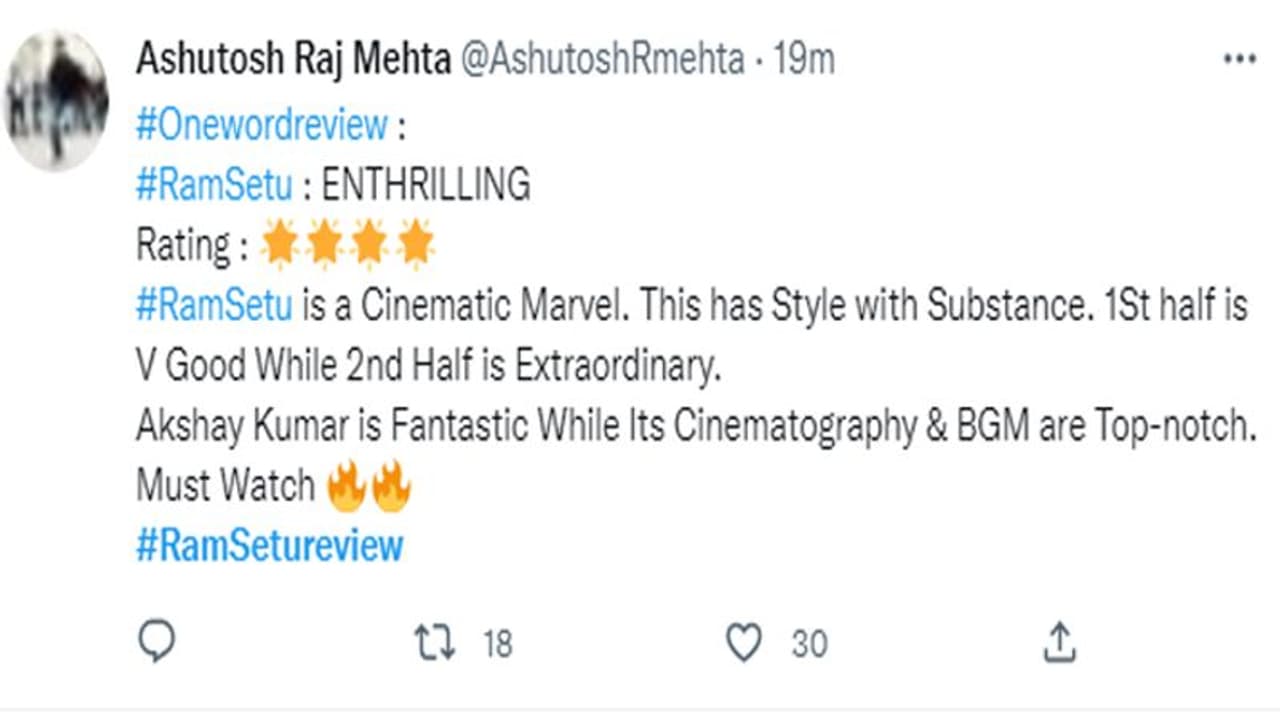 एक यूजर का ट्वीट है, "एक शब्द में रिव्यू। राम सेतु मनमोहक है।राम सेतु सिनेमैटिक मार्वल है। इसमें स्टाइल है और सब्सटेन्स है। पहला हाफ बहुत अच्छा है, जबकि दूसरा हाफ असाधारण है।अक्षय कुमार शानदार हैं, जबकि सिनेमैटोग्राफी और बैकग्राउंड म्यूजिक बेतरीन हैं। जरूर देखें।"