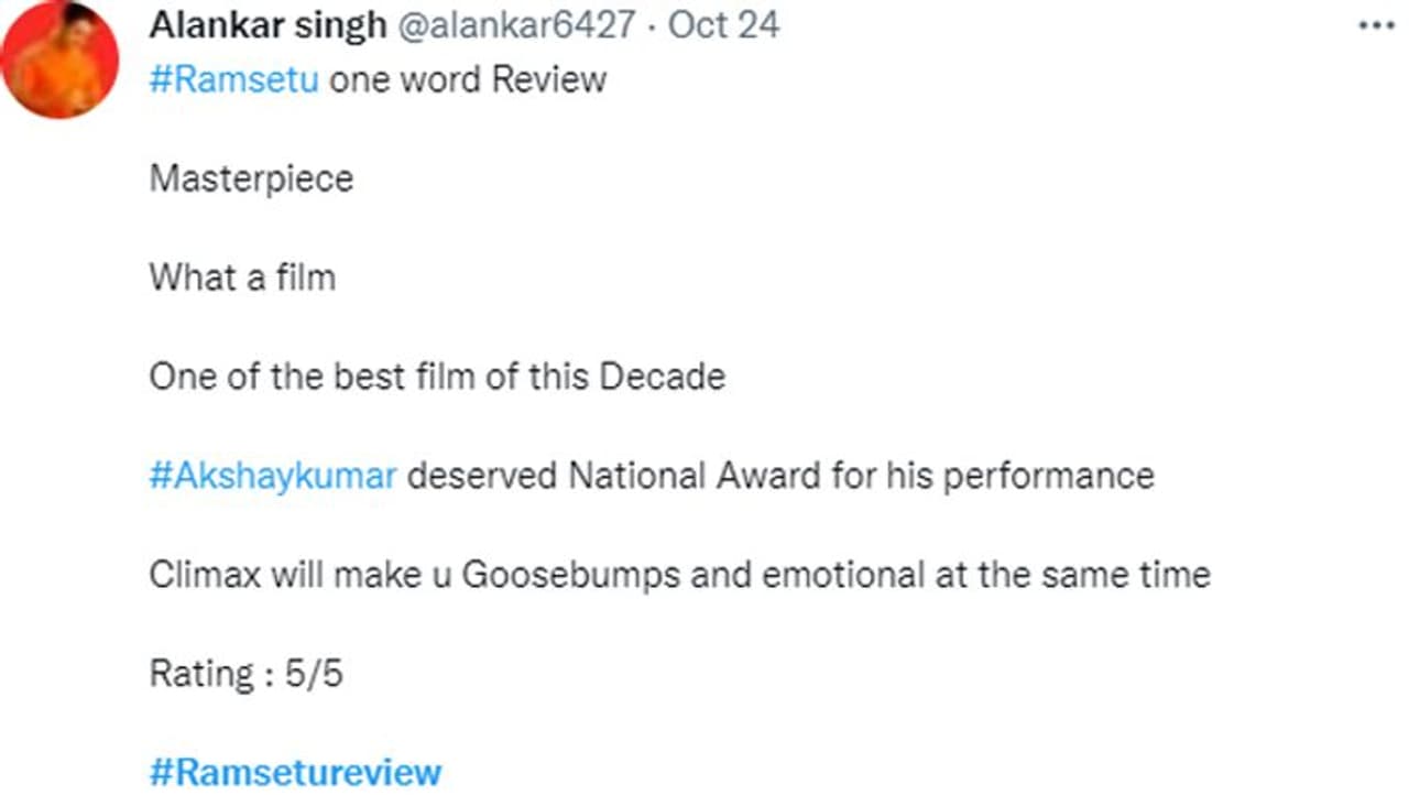 एक यूजर का ट्वीट है, "राम सेतु का एक शब्द में रिव्यू। मास्टरपीस। क्या फिल्म है। दशक की सबसे बेहतरीन फिल्मों में से एक। अक्षय कुमार अपने परफॉर्मेंस के लिए नेशनल अवॉर्ड डिजर्व करते हैं। क्लाइमैक्स आपको इमोशनल और आपके रोंगटे खड़े कर देगा।"