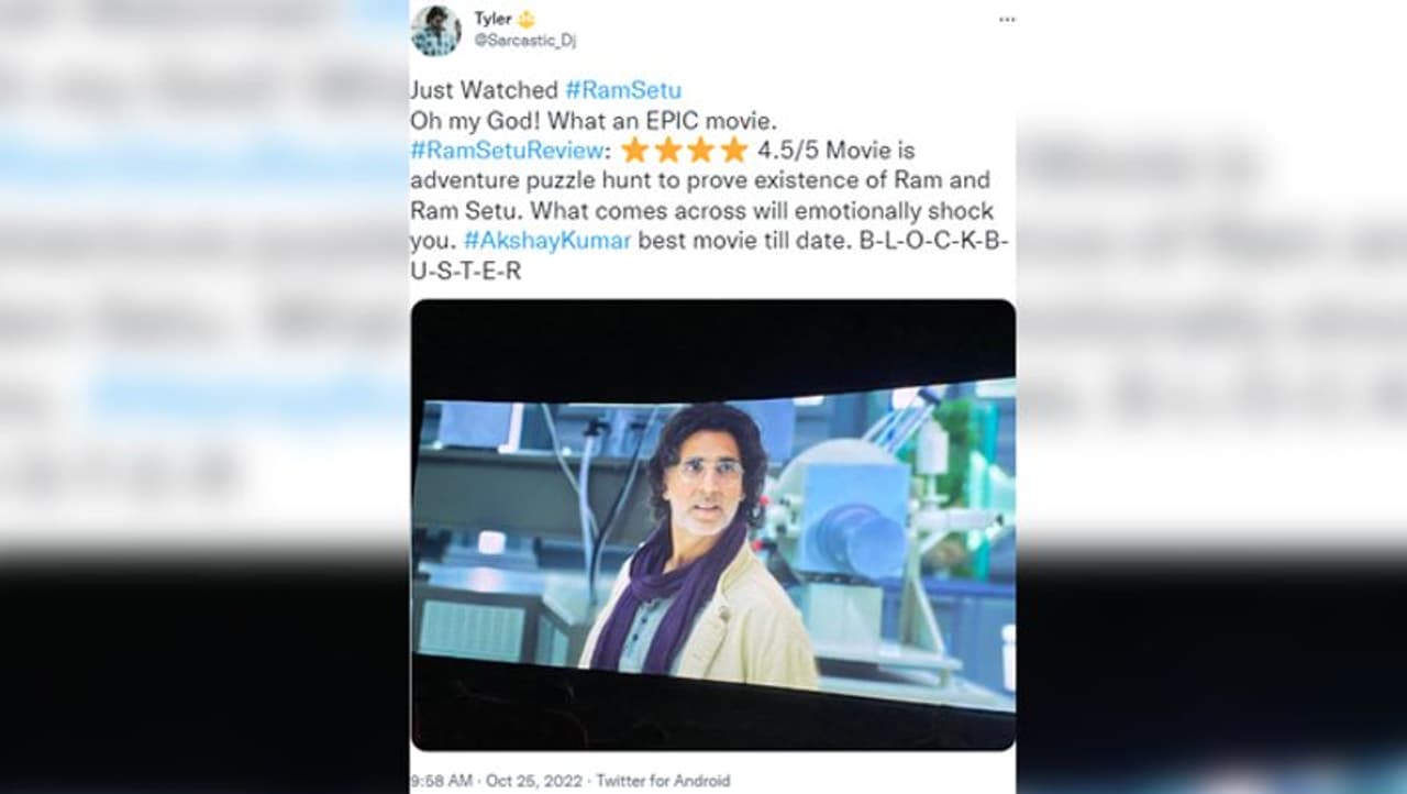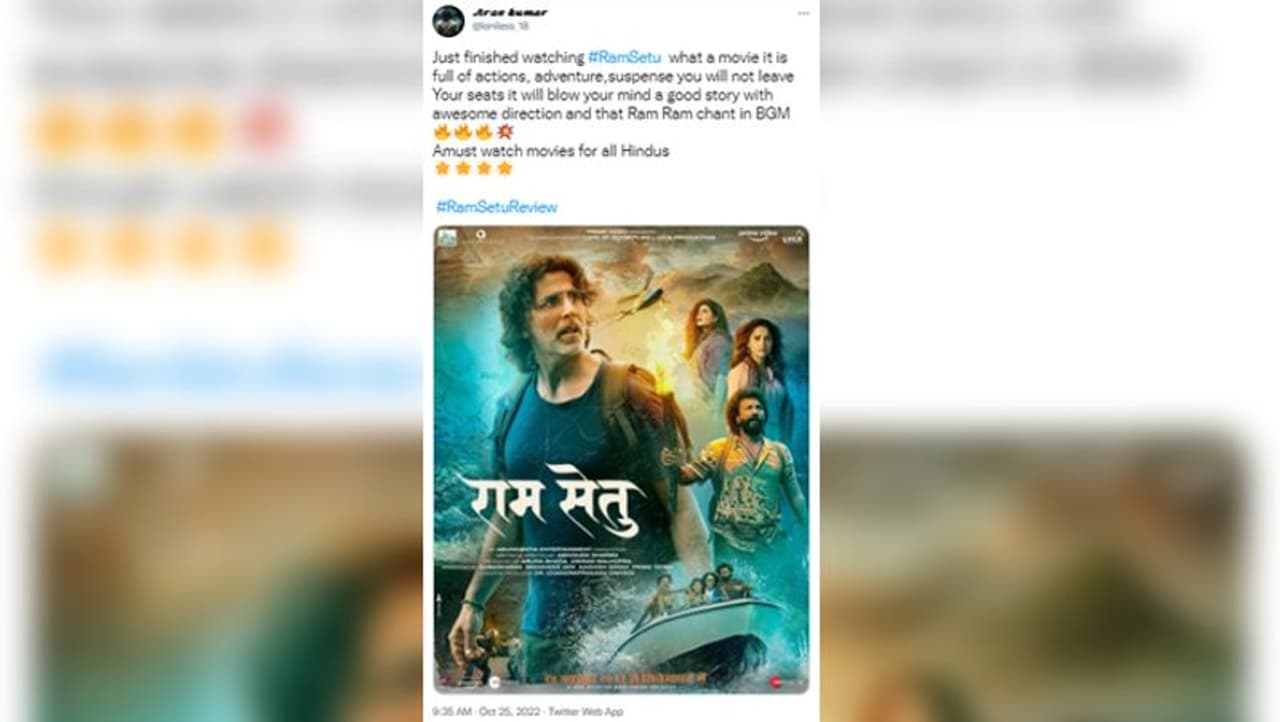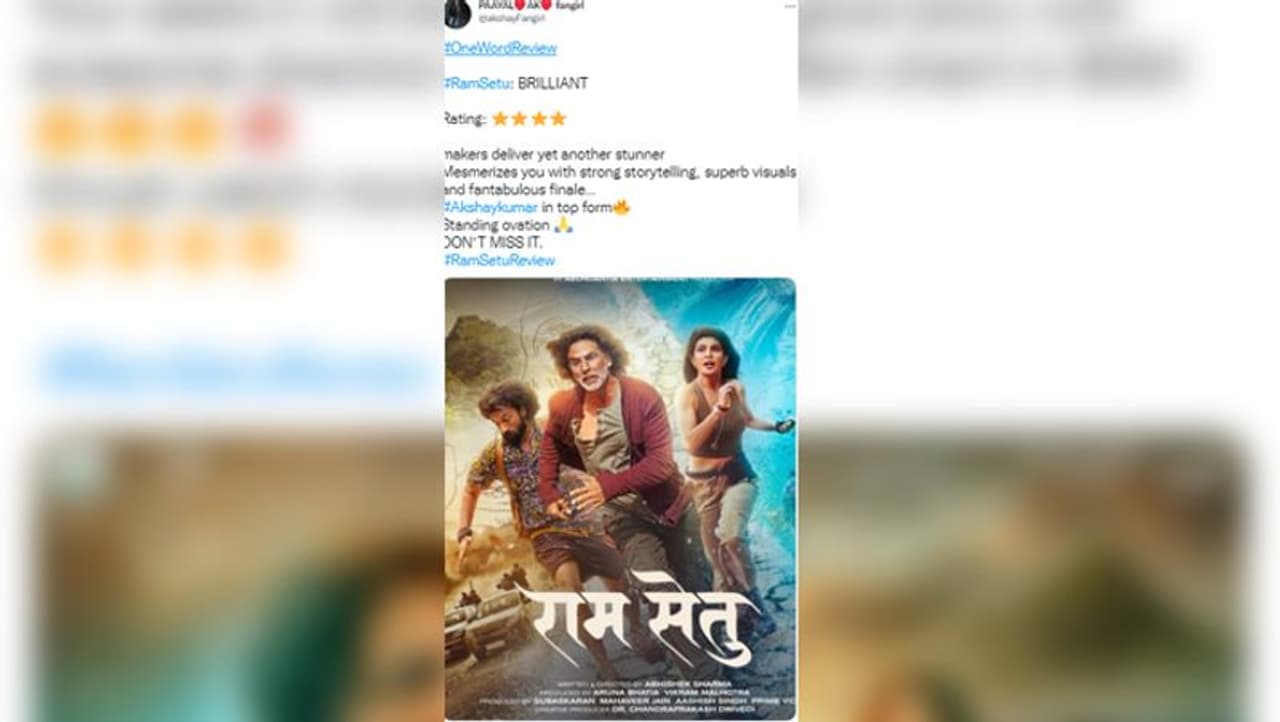 अक्षय कुमार की फिल्म देखने के बाद एक सोशल मीडिया यूजर ने लिखा है, "अभी राम सेतु देखी। ओह माय गॉड! क्या एपिक मूवी है। 'राम सेतु' 4.5/5 स्टार के साथ राम सेतु के अस्तित्व को साबित करने वाली एक एडवेंचर्स पजल है। जो सामने आएगा, वह भावनात्मक रूप से झकझोर कर रख देगा। अक्षय कुमार की आज तक की सबसे बेहतर फिल्म। ब्लॉकबस्टर।"