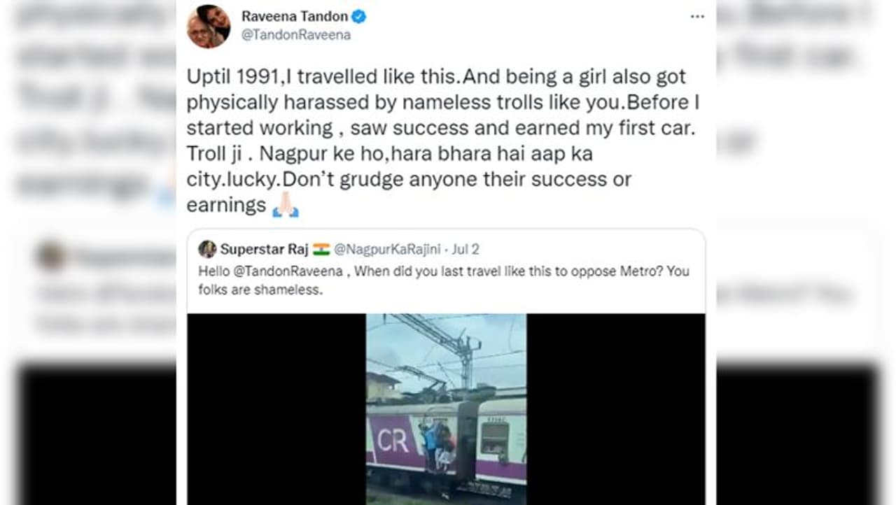 जब एक सोशल मीडिया यूजर ने रवीना से पूछा कि उन्होंने मुंबई लोकल में कब सफर किया है तो उन्होंने जवाब दिया, "1991 तक मैंने ऐसे ही सफ़र किया है। एक लड़की होने के नाते आप जैसे बिना नाम वाले ट्रोलर्स ने मेरा शारीरिक शोषण किया है। काम शुरू करने से पहले मैंने सफलता देखी और अपनी पहली कार खरीदी। ट्रोल जी, नागपुर के हो। हरा-भरा है आपका शहर। खुशकिस्मत हो। किसी की सफलता और कमाई के बारे में चिंता न करें।"