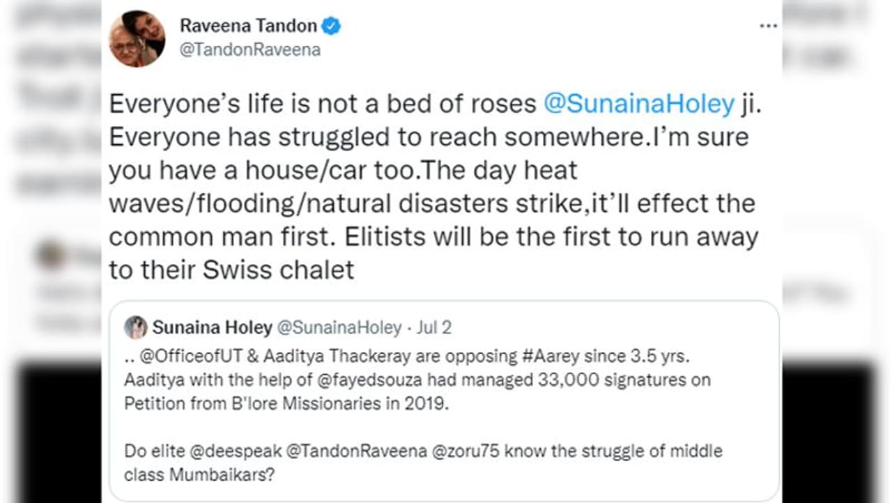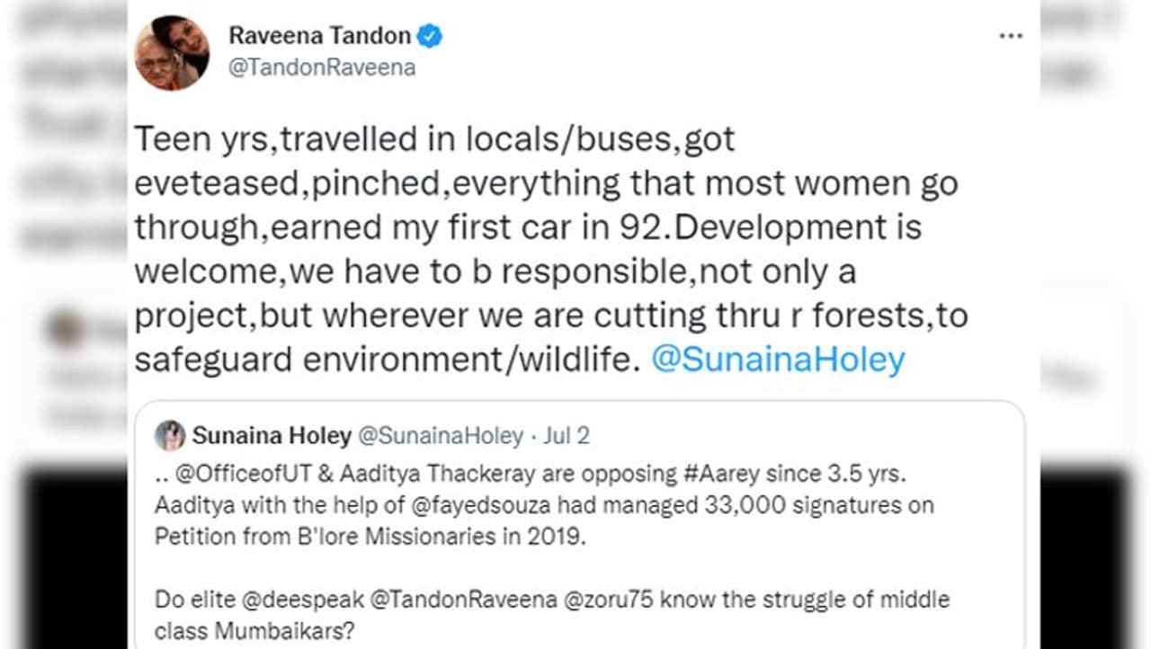 रवीना ने पहले ट्वीट में लिखा, "किशोरावस्था में लोकल/बसों में सफ़र किया है। मेरे साथ छेड़खानी हुई, चुटकी ली गई। वह सबकुछ हुआ, जिससे ज्यादातर महिलाएं गुजरती हैं। मेरी पहली कार 1992 में आई थी। विकास का स्वागत है। हमें सिर्फ एक प्रोजेक्ट के लिए नहीं, बल्कि जहां भी वन्यजीवों और पार्यावरण को सुरक्षा प्रदान करने वाले जंगलों को हम काट रहे हैं, उसके लिए जिम्मेदार होना होगा।"