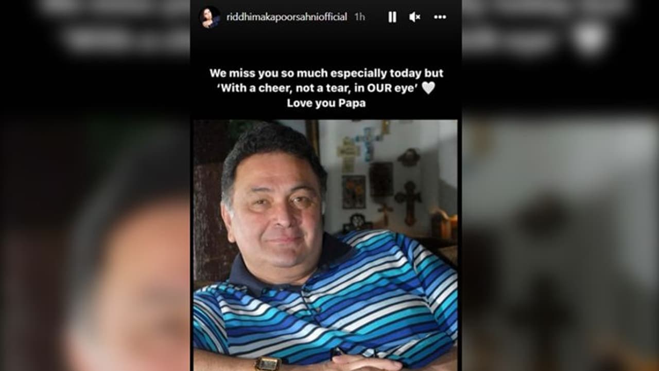 वहीं, रिद्धिमा ने इंस्टा स्टोरी पर ऋषि की फोटो साझा करते हुए लिखा है, "हमें आपकी बहुत याद आती है। खासकर आज। लेकिन आज ख़ुशी के साथ, हमारी आँखोंन में आंसू नहीं हैं।" रिद्धिमा ने इसके आगे व्हाइट हार्ट इमोजी साझा करते हुए लिखा है, "लव यू पापा।"