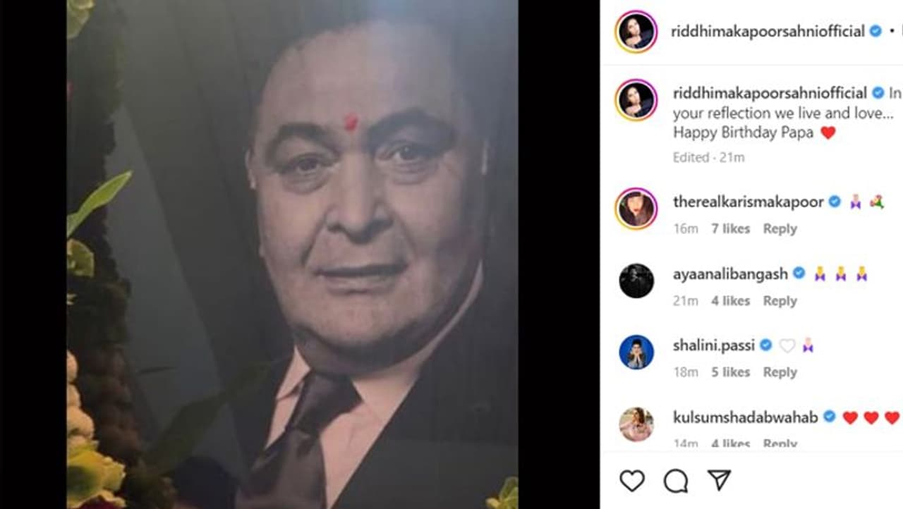 रिद्धिमा ने इंस्टाग्राम पर भी ऋषि कपूर की एक ब्लैक एंड व्हाइट फोटो साझा की है, जिस पर माला चढ़ी हुई है। तस्वीर में रिद्धिमा और रणबीर के प्रतिबिम्ब भी दिखाई दे रहे हैं। इसे पोस्ट करते हुए रिद्धिमा ने लिखा है, "आपके प्रतिबिम्ब में हम रहते हैं और प्यार करते हैं। हैप्पी बर्थडे पापा।"