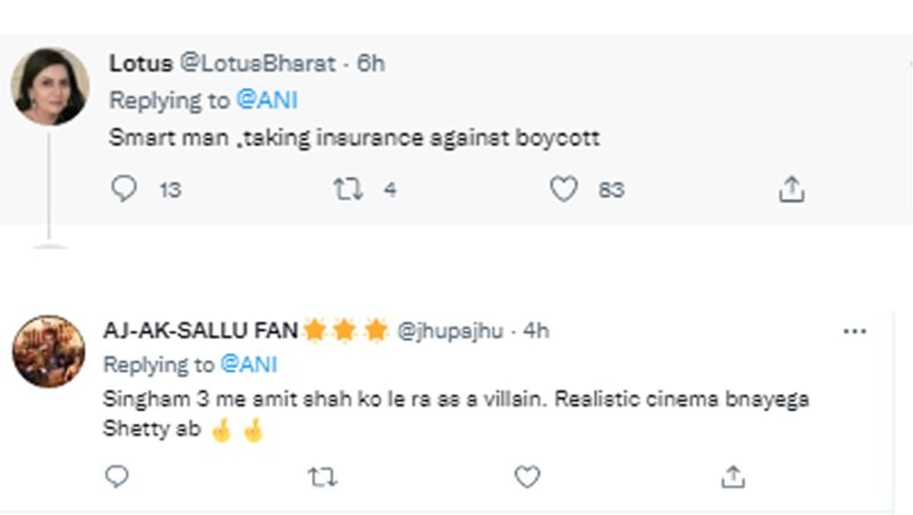 एक यूजर का कमेंट है, "स्मार्ट मैन। बायकॉट का इंश्योरेंस ले रहा है।" एक यूजर ने लिखा, "सिंघम 3 में अमित शाह को विलेन के रूप में ले रहे। रियलस्टिक सिनेमा बनाएगा शेट्टी अब।"