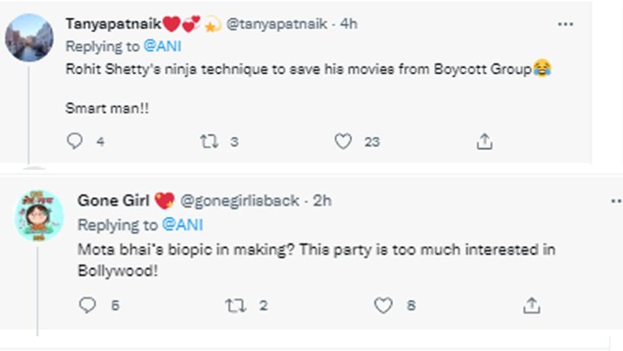 अमित शाह के साथ रोहित शेट्टी की तस्वीर देखकर कुछ लोग शेट्टी का मजाक उड़ा रहे हैं तो कुछ कयास लगा रहे हैं कि कुछ बड़ा होने जा रहा है। मसलन एक यूजर ने लिखा है, "बायकॉट ग्रुप को रोकने के लिए रोहित शेट्टी की निंजा तकनीक। स्मार्ट मैन।" एक यूजर का कमेंट है, "मोटा भाई की बायोपिक बन रही है? यह पार्टी बॉलीवुड में काफी इन्ट्रेस्टेड है।"