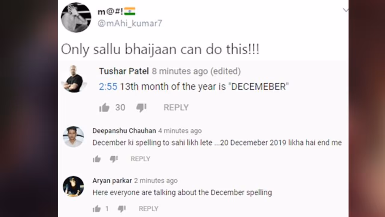 ट्रेलर को लेकर सोशल मीडिया यूजर्स तरह-तरह के कमेंट्स और मीम्स बना रहे हैं। एक यूजर ने लिखा, 'पहले फिजिक्स की ऐसी-तैसी करते थे, अब अंग्रेजी की कर रहे हैं।' दूसरे ने लिखा, 'ऐसा सिर्फ सल्लू भाईजान कर सकते हैं।' वहीं, एक ने लिखा, साल का 13वां महीना 'DECEMEBER'इसके साथ ही सभी यूजर्स का इशारा गलत स्पेलिंग की ओर रहा।