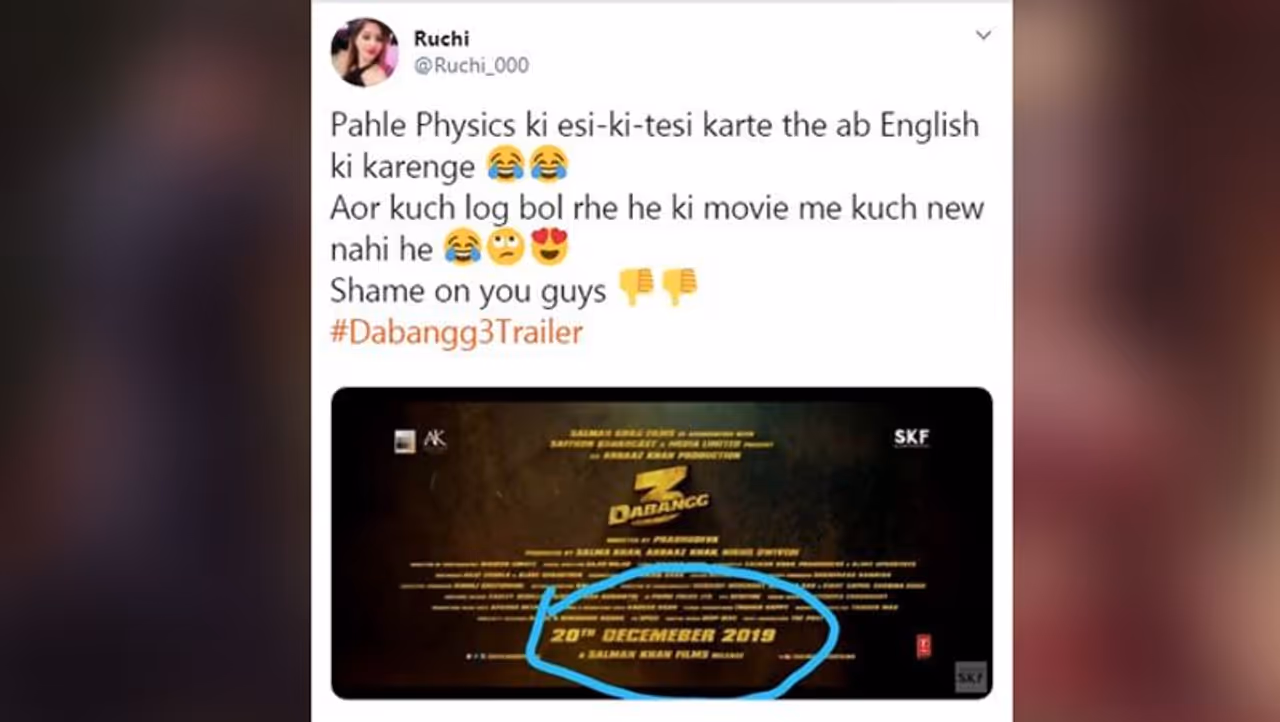 मुंबई. सलमान खान, सोनाक्षी सिन्हा स्टारर फिल्म 'दबंग 3' का ट्रेलर बुधवार को रिलीज किया गया। इसका फैंस बेसब्री से इंतजार कर रहे थे। ट्रेलर को फैंस से मिला-जुला रिस्पांस मिला। फैंस ने ट्रेलर में सलमान एक्शन और किच्चा सुदीप के रोल की जमकर तारीफ की। अब ट्रेलर के आखिरी में दिसंबर की स्पेलिंग गलत होने के कारण सोशल मीडिया पर इसका मजाक उड़ाया जा रहा है। इसमें DECEMBER की जगह DECEMEBER लिखा गया है।